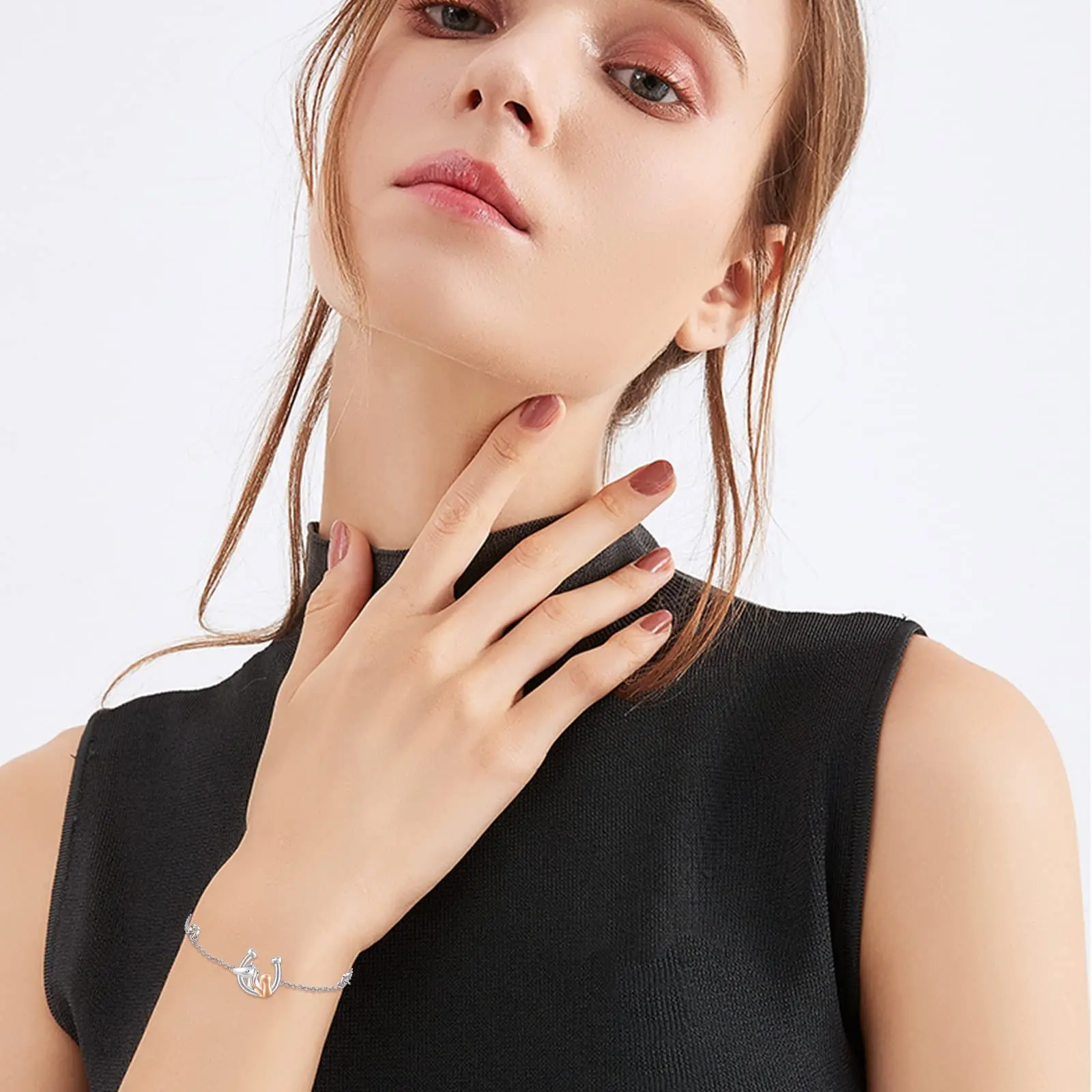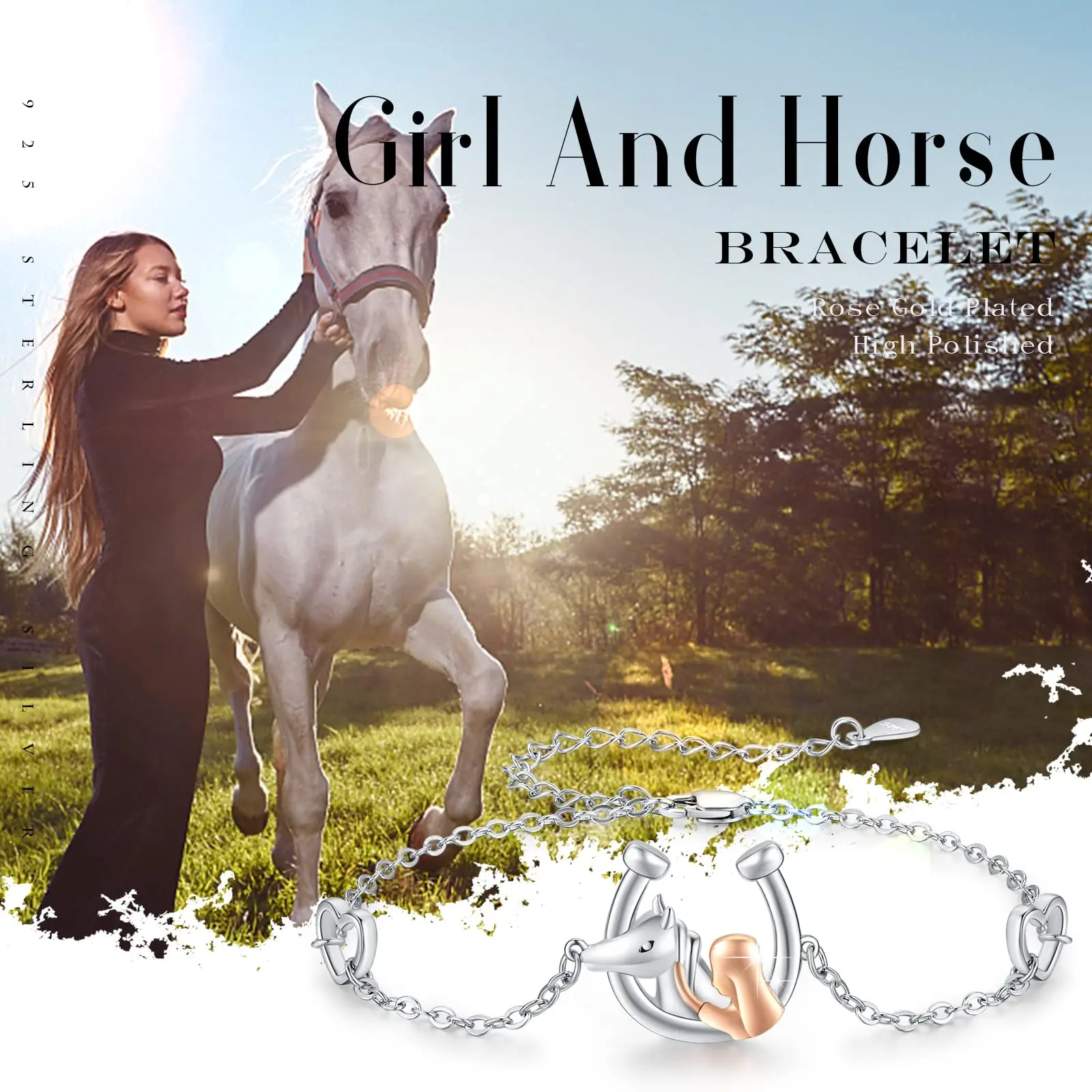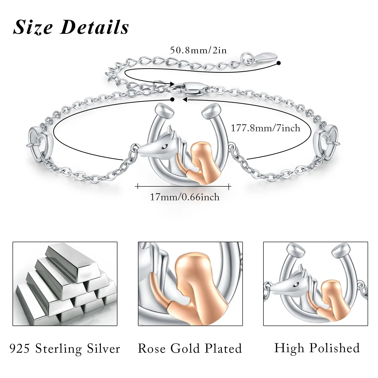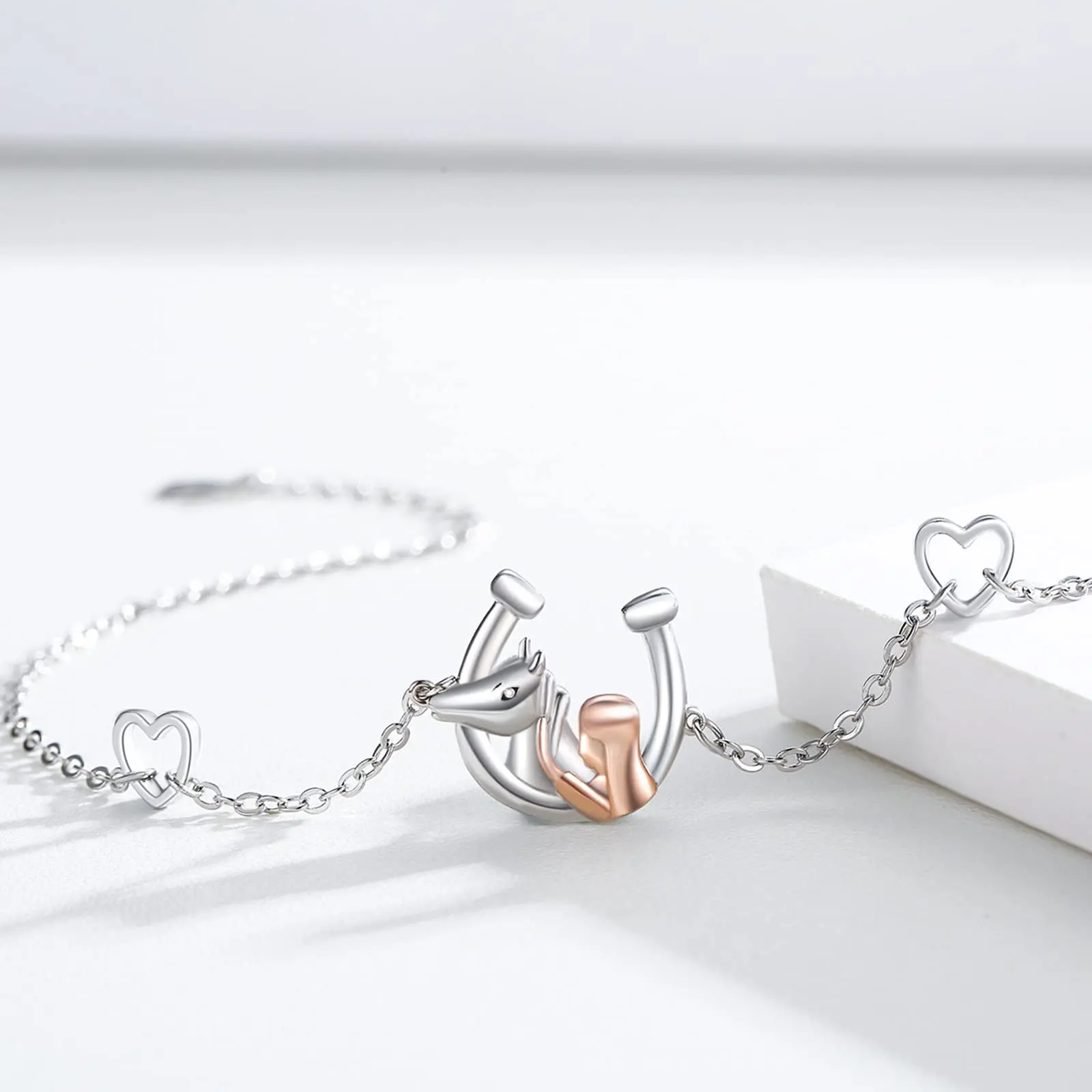 High Quality Design 925 Sterling Silver Heart 7+2 Inch Chain Two Tone Girl And Horse Bracelet