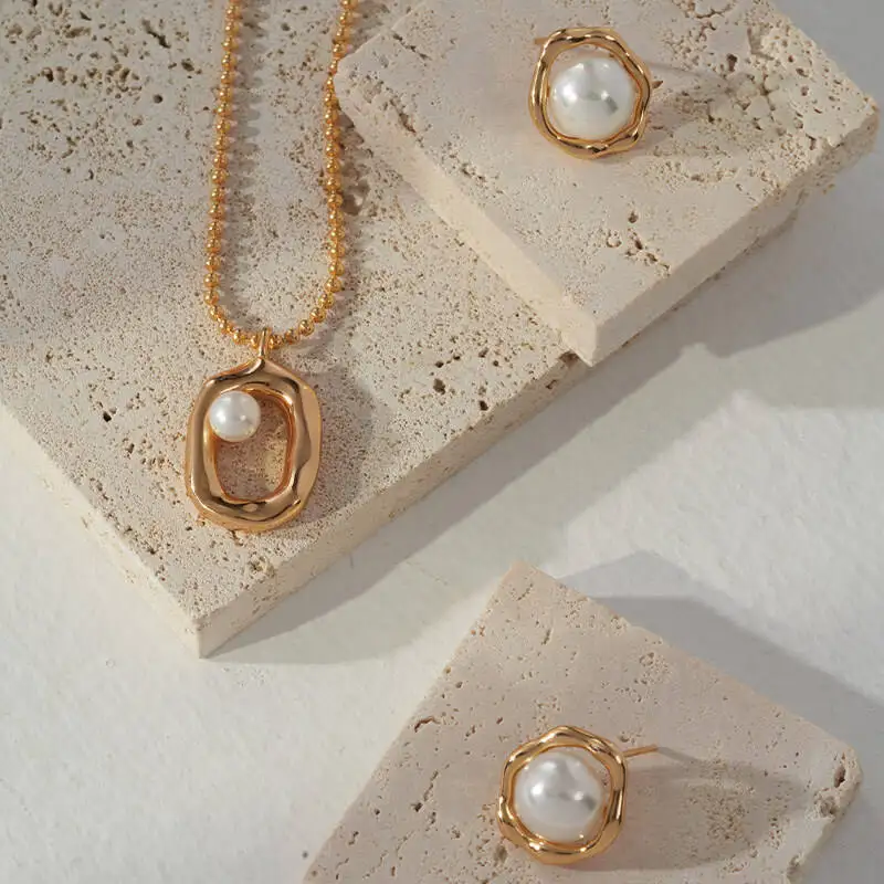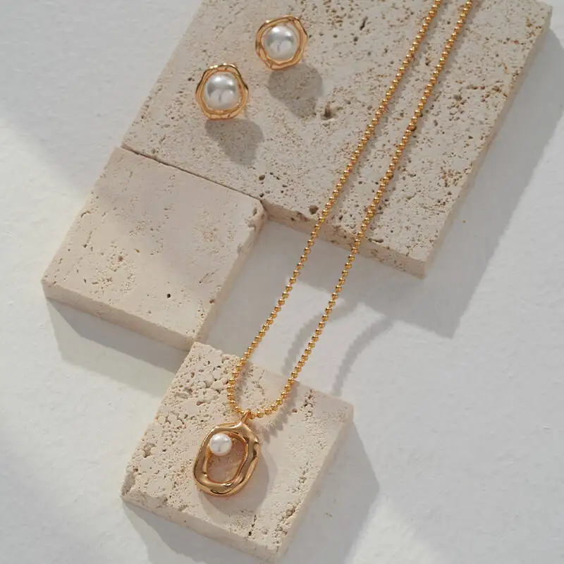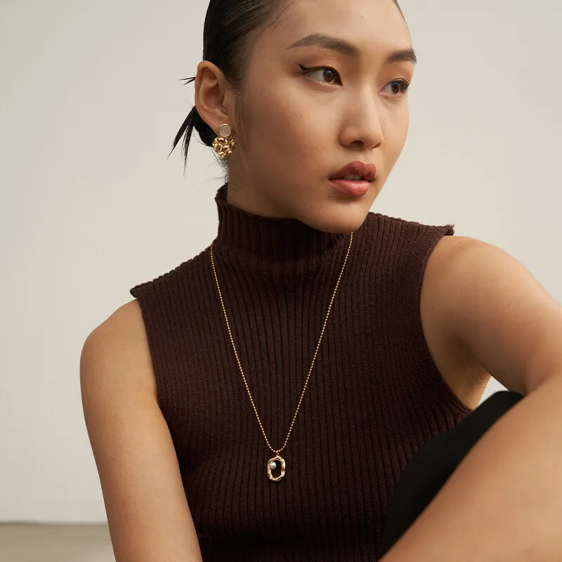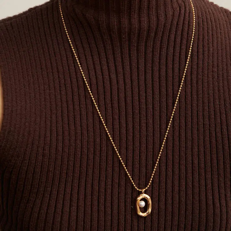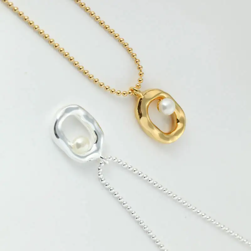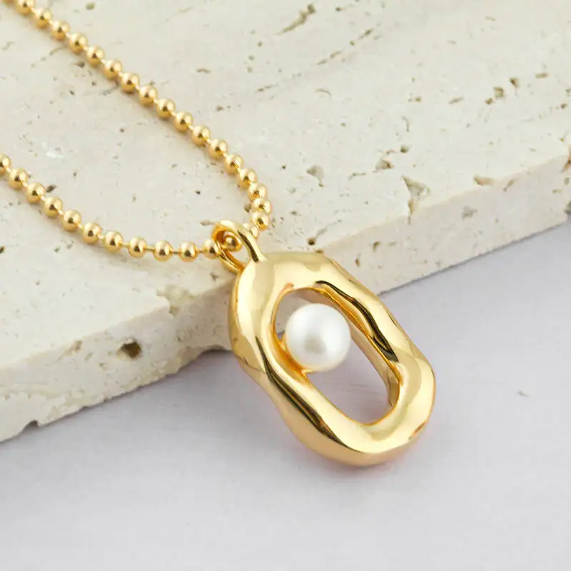 925 Sterling Silver Gold Plated Bead Chain Hollow Oval Shape Pearl Setting Pendant Necklace