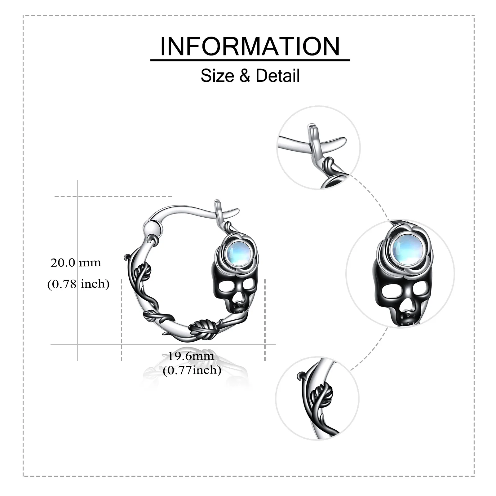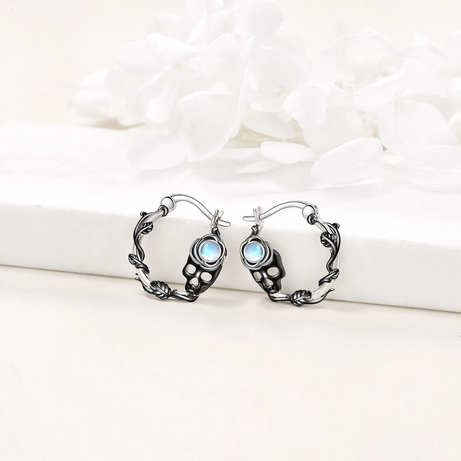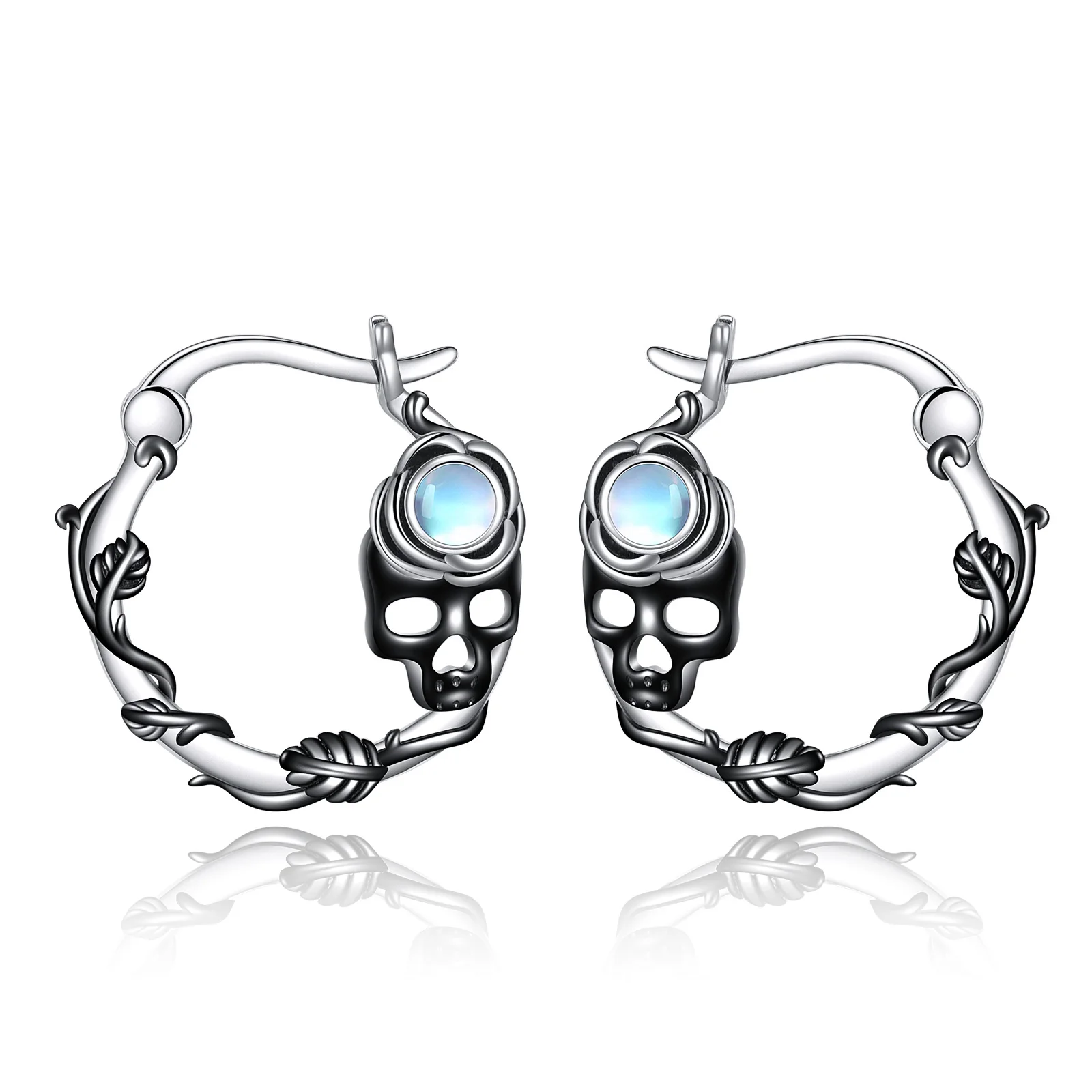 Halloween New Design 925 Sterling Silver Skull Rose Hollow Moonstone Hoop Earrings