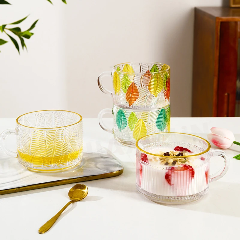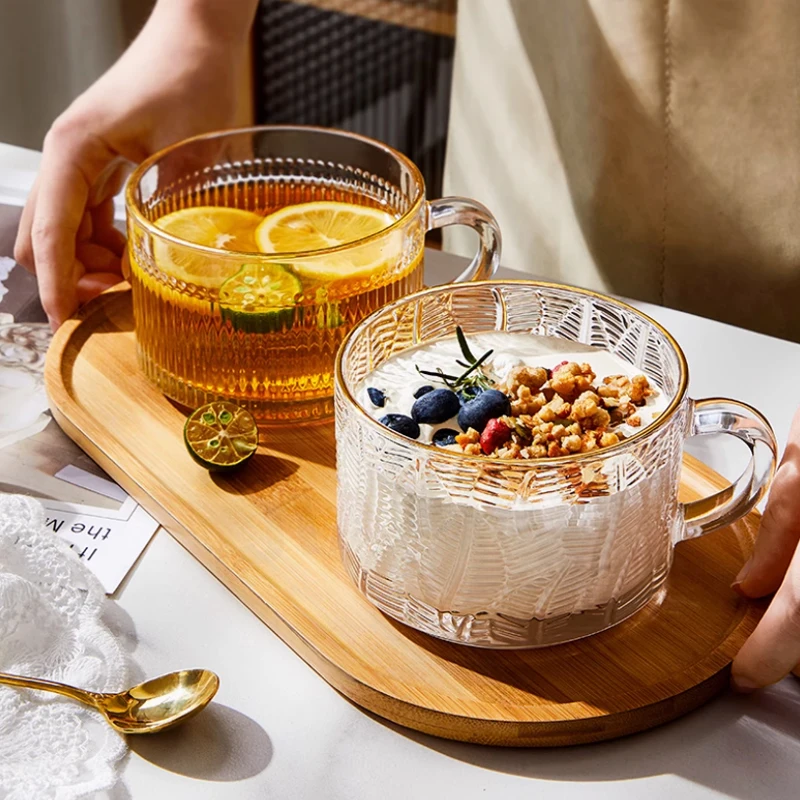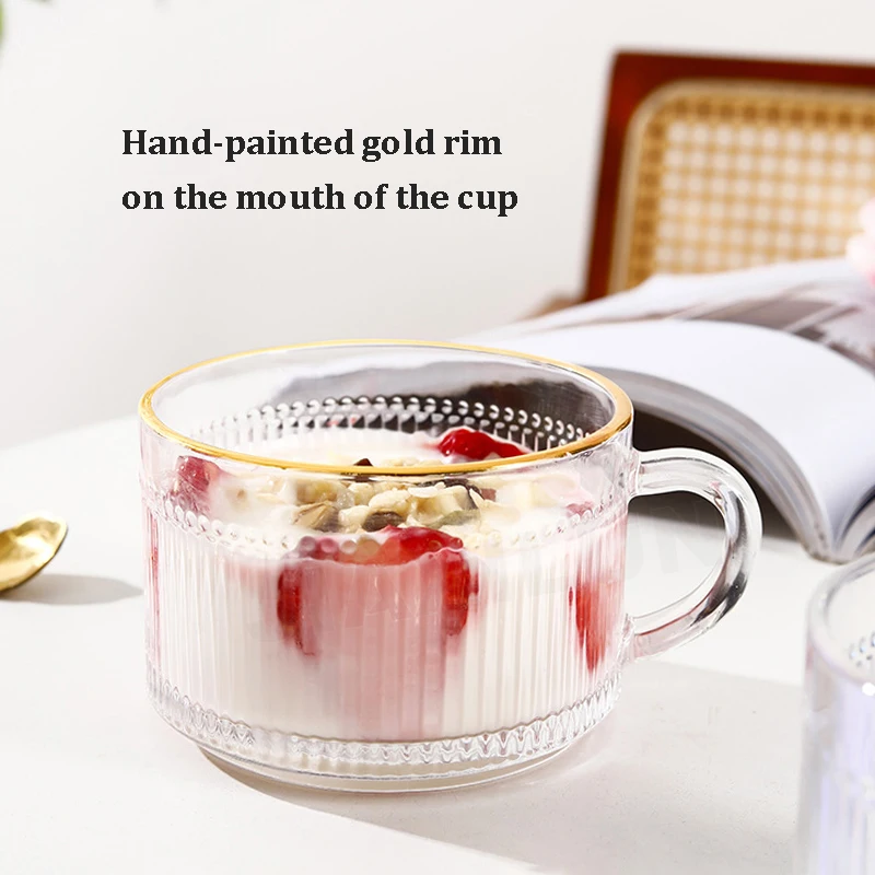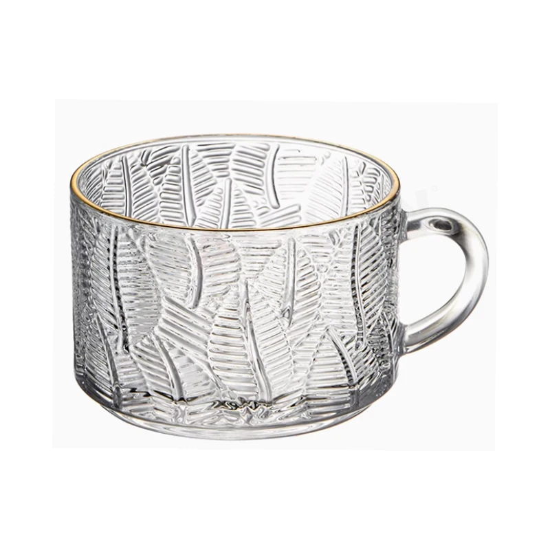 Classic Design Vintage Crystal Transparent Carving Glass Cup with Golden Rim Handle Breakfast Mug for Elegant Gift Presentation