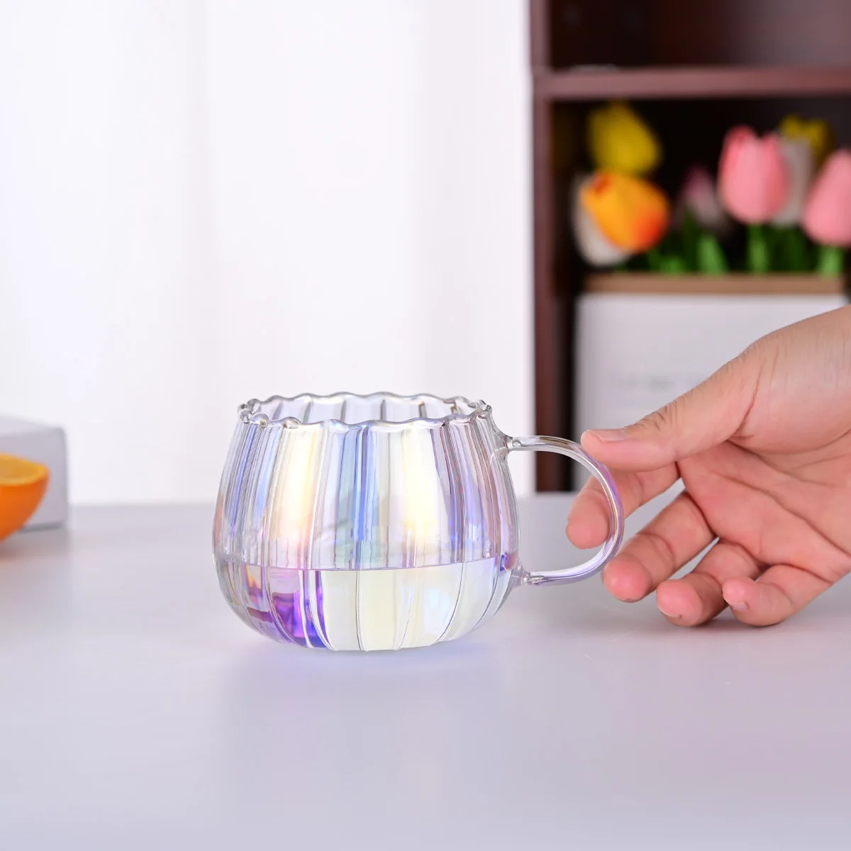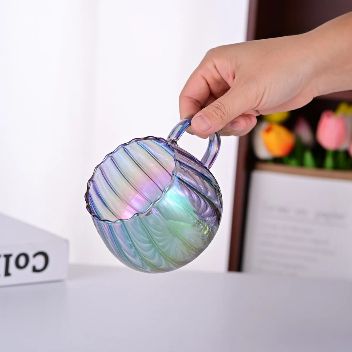 Hot selling product, vertical patterns,Electroplating process,glass tea cups with handles,high borosilicate glass cup,juice cup