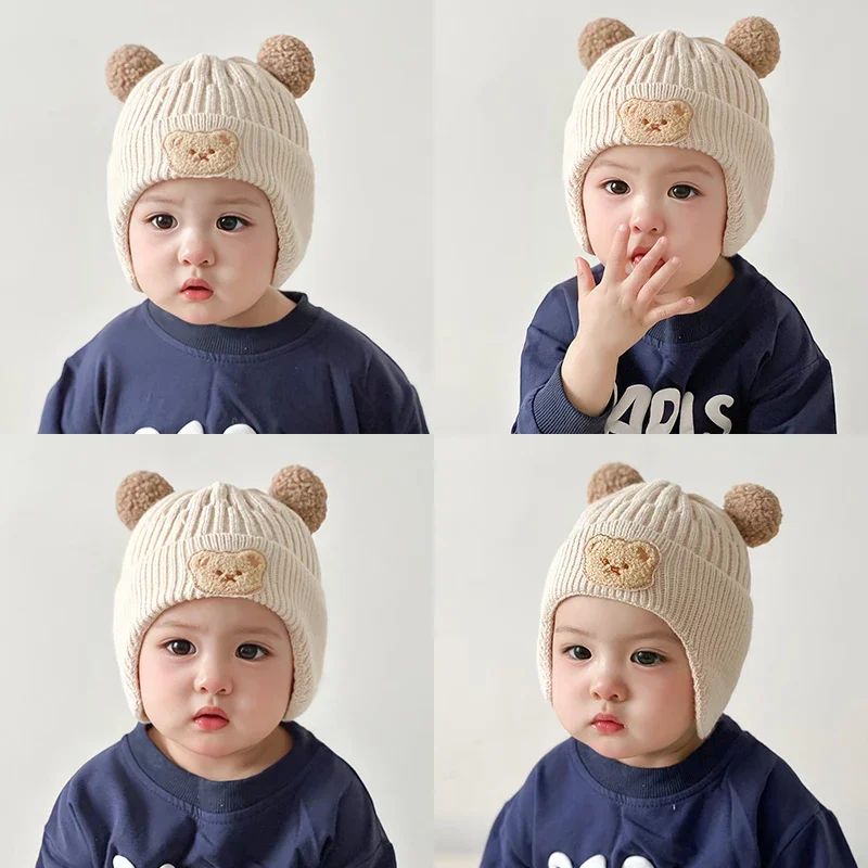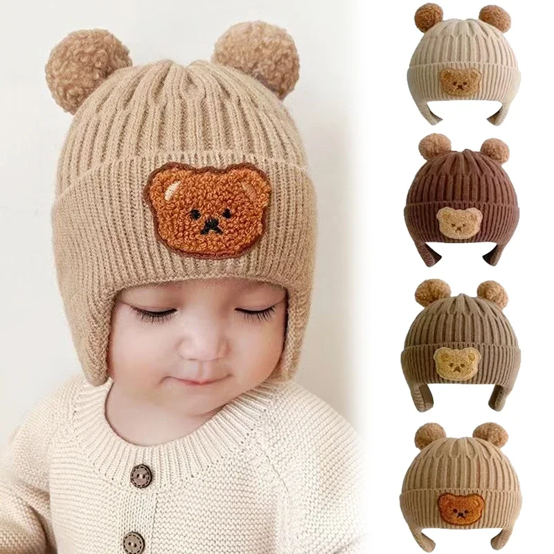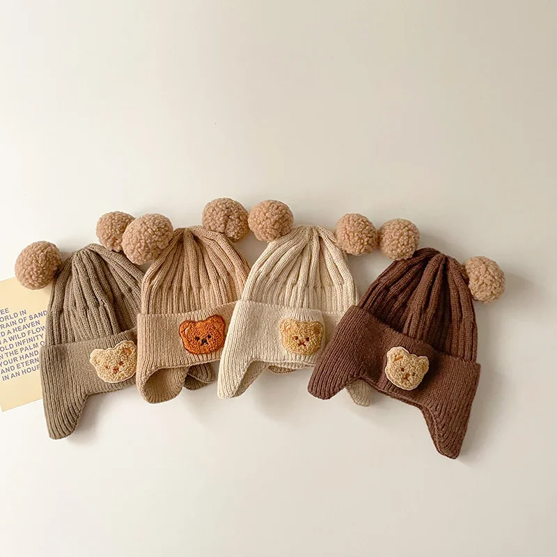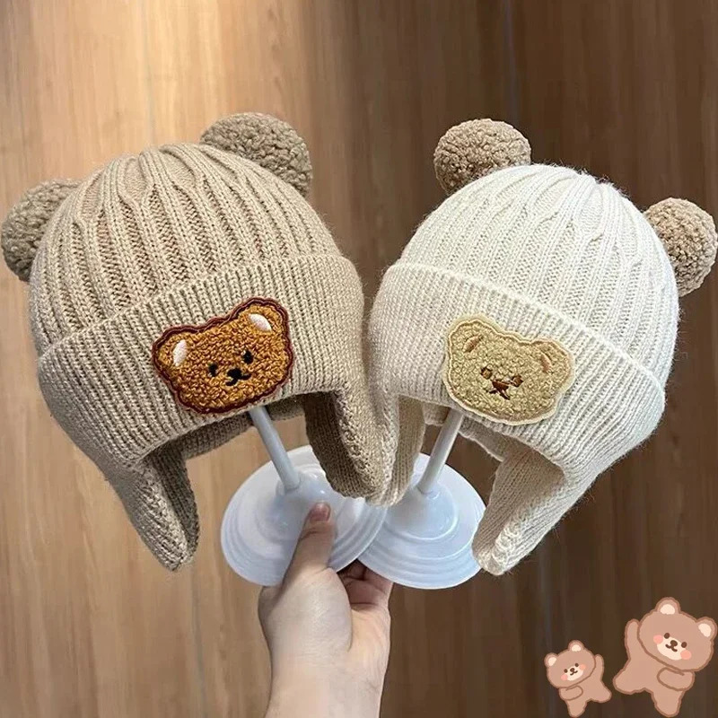 Baby Ear Protection Hats Cute Bear Embroidered Pullover Wool Knit Hat Children Autumn and Winter Thickened Warm Windproof Hats