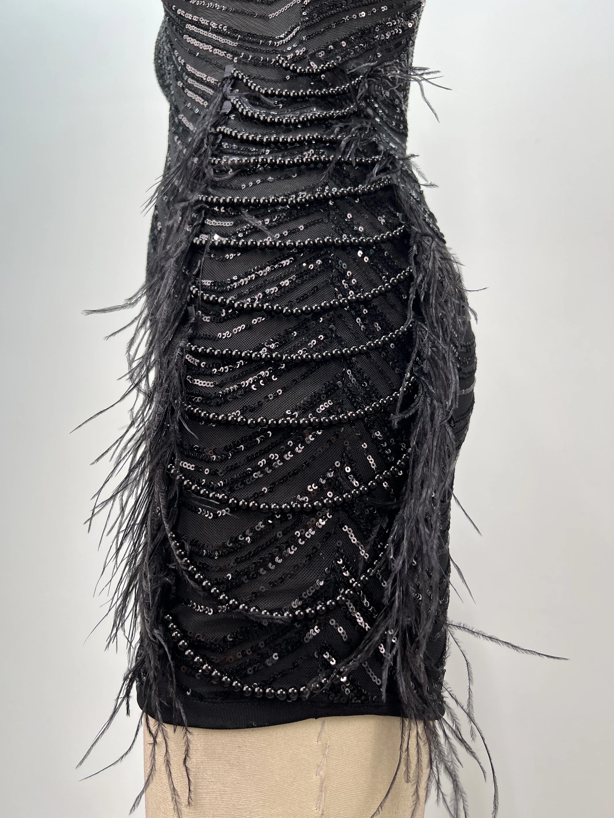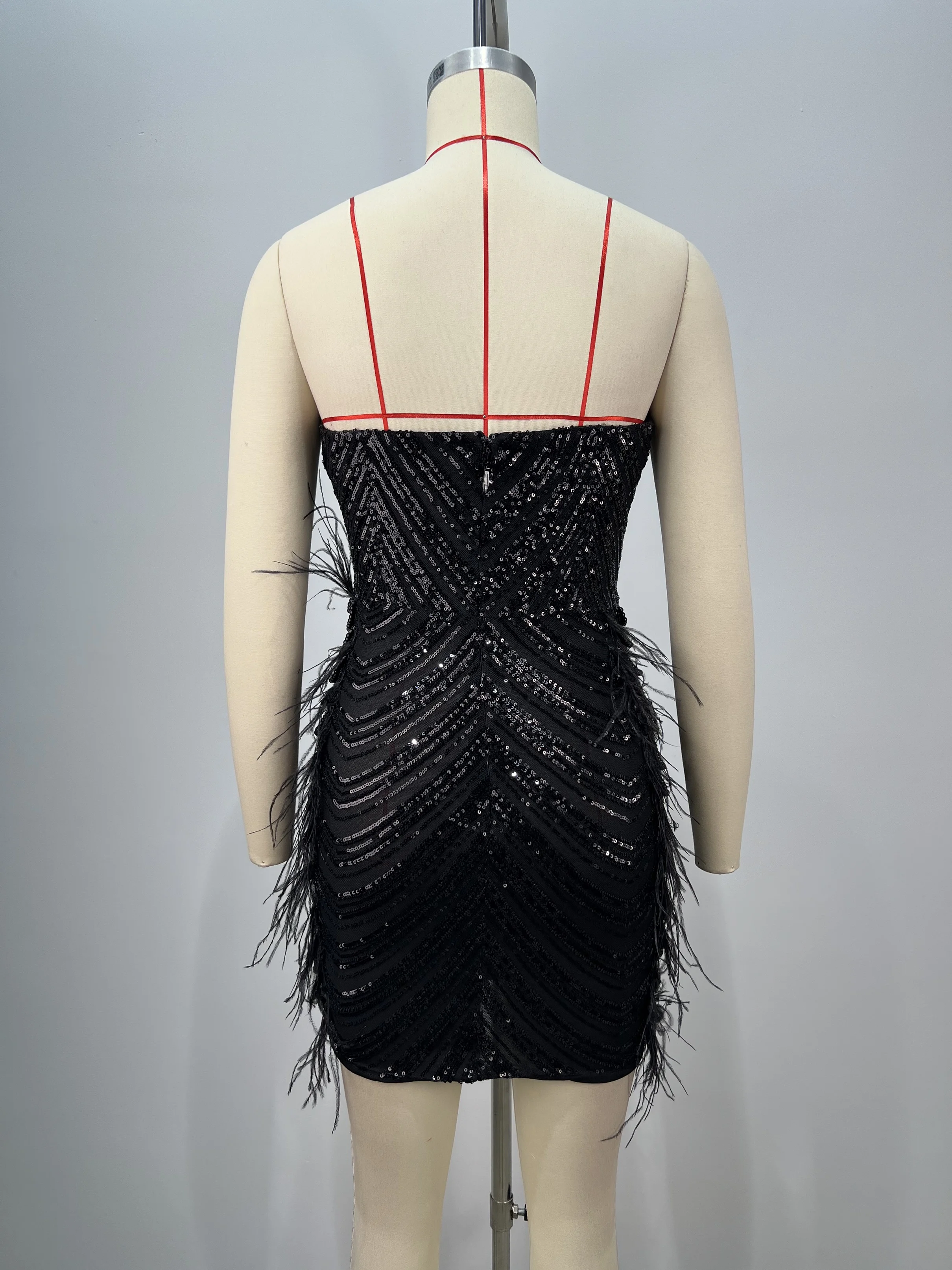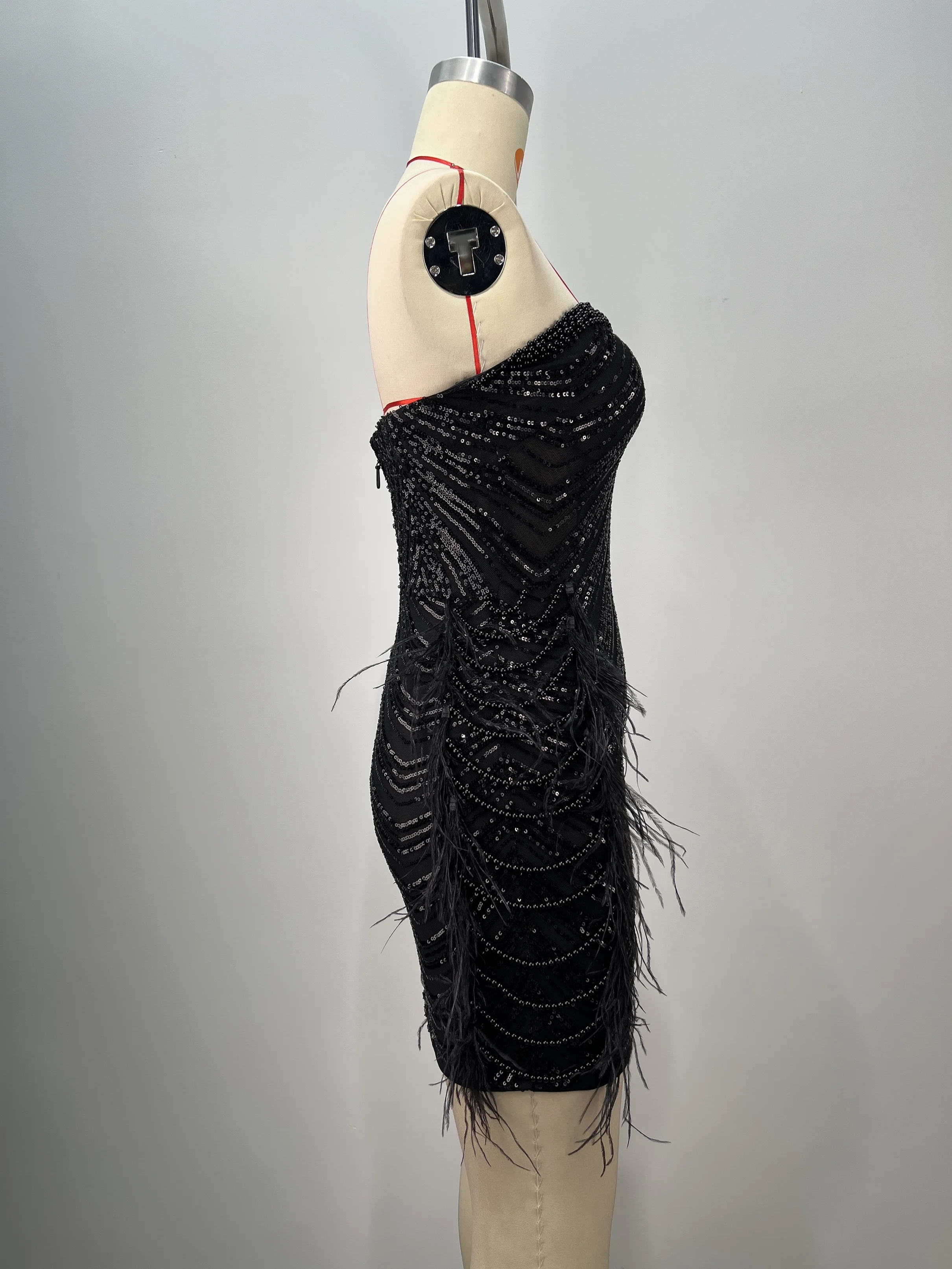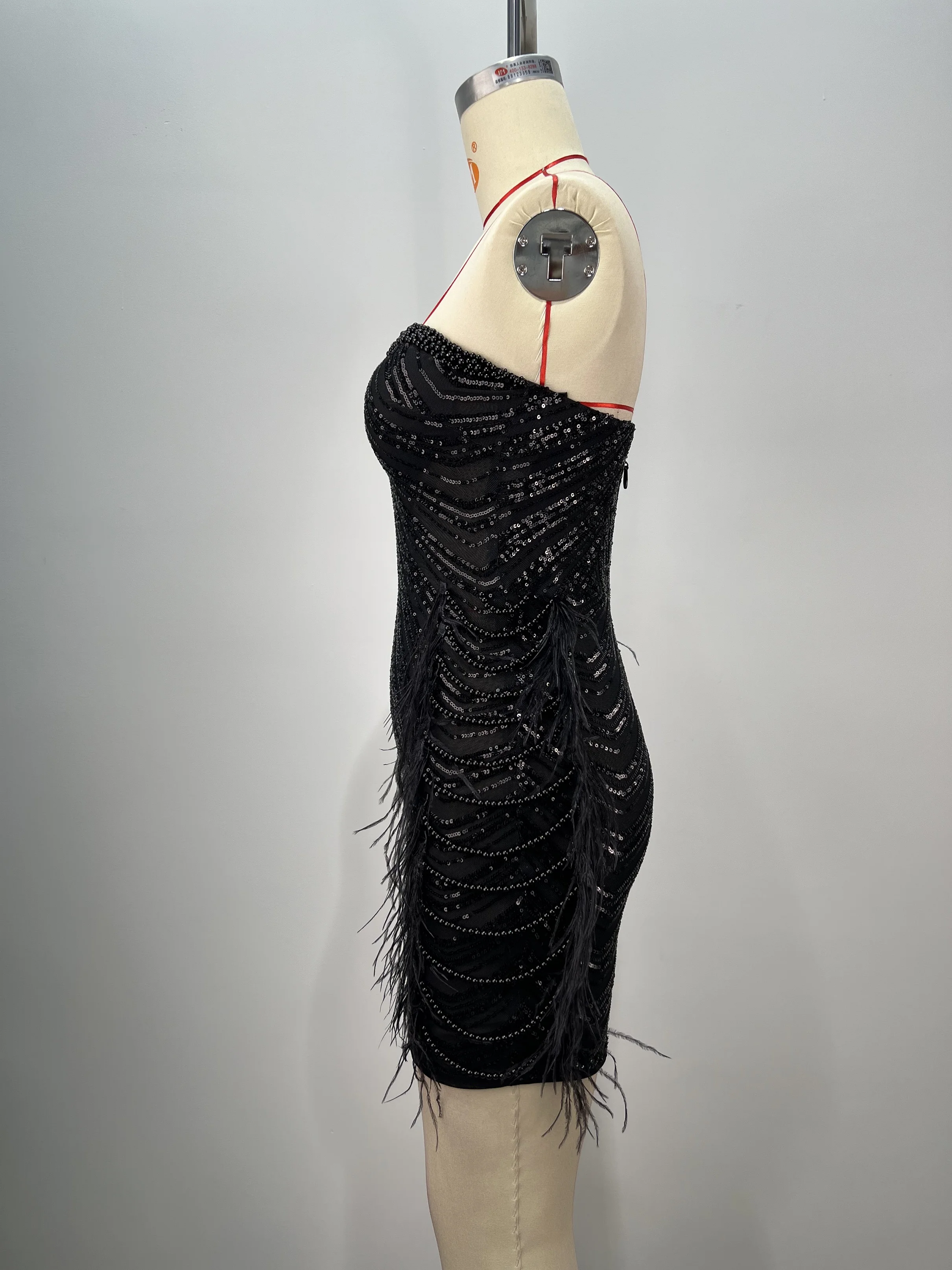 A9705 New Style Black Mini Dress Strapless sequin feather pearl tassel Sexy Slit Fashion Dress For Women Party Wear