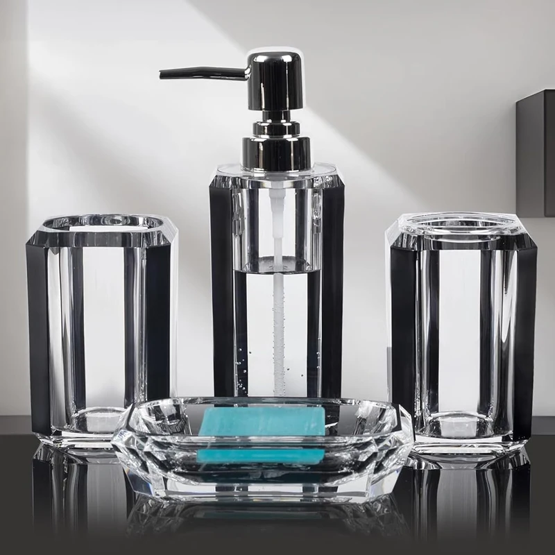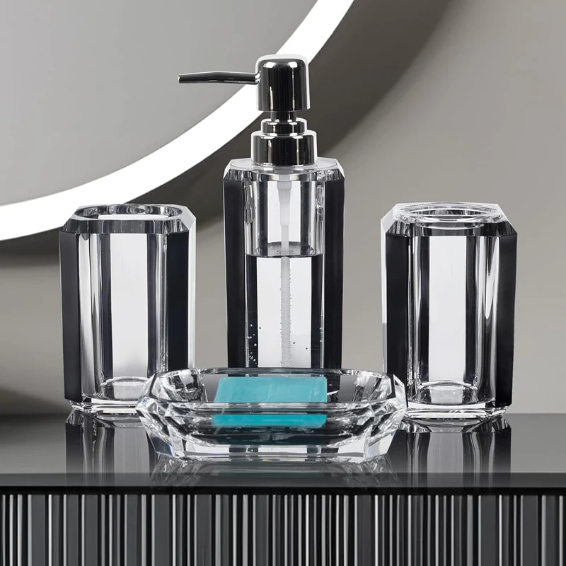 4 Piece Plastic Lotion Soap Dispenser Mouthwash Toothbrush Cup Premium Acrylic Clear Bathroom Accessory Set