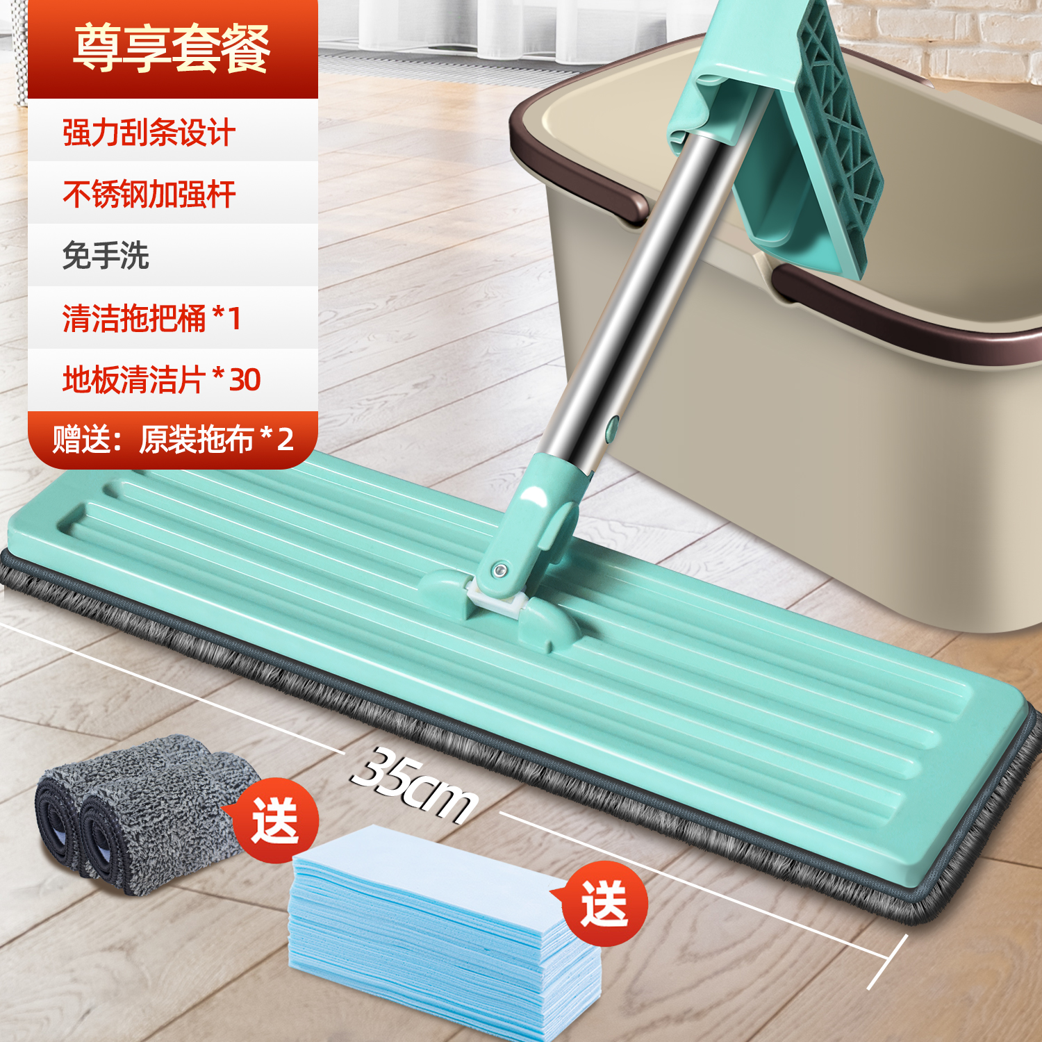suit three flagship flat mop +2 pieces of cloth + cleaning bucket