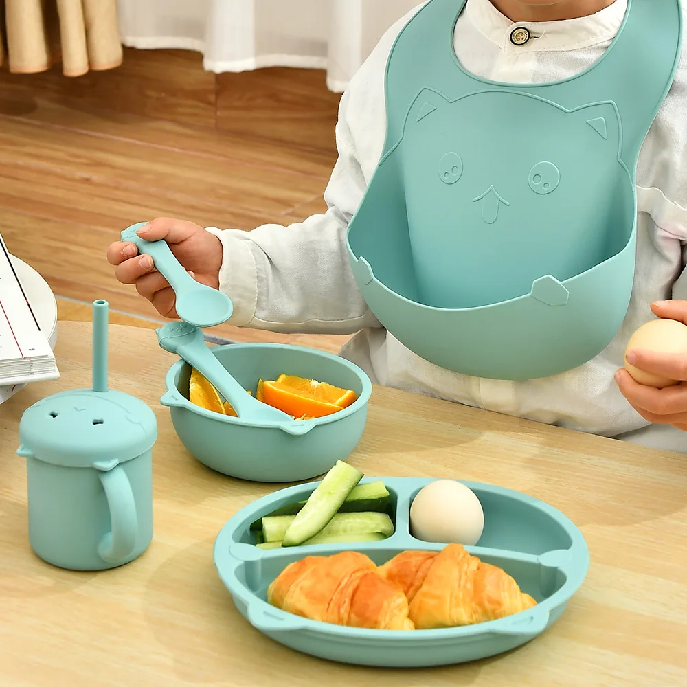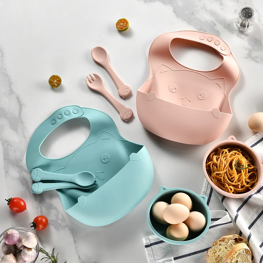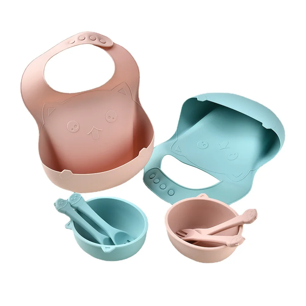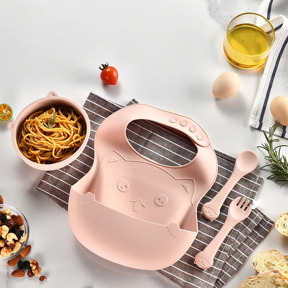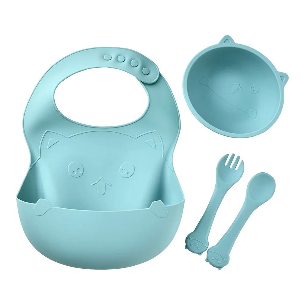 Cartoon children's tableware set silicone food bowl saliva pocket baby silicone spoon fork antibacterial tableware