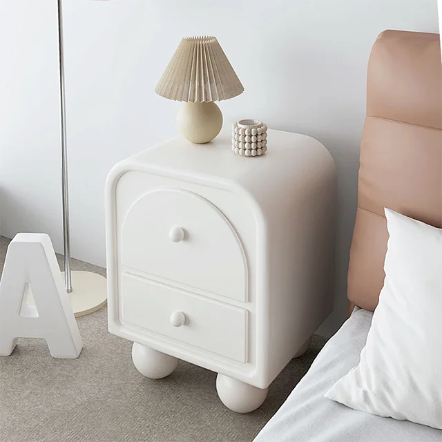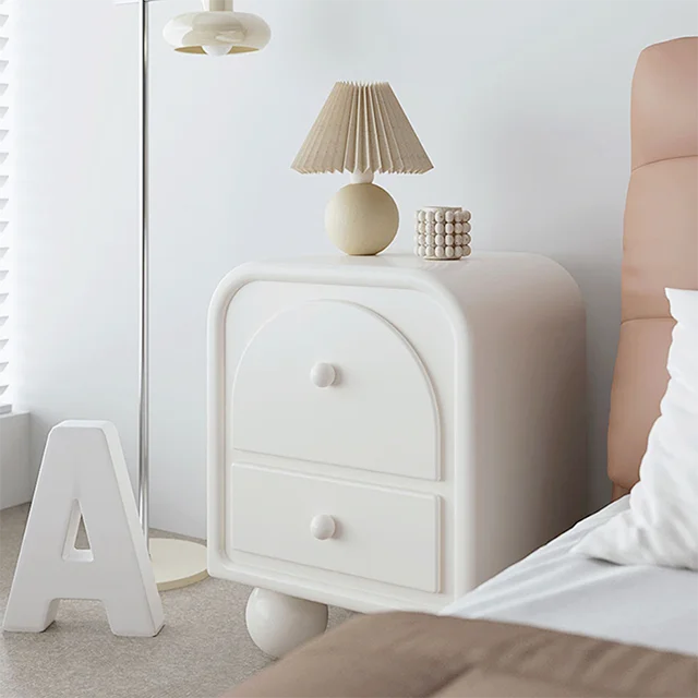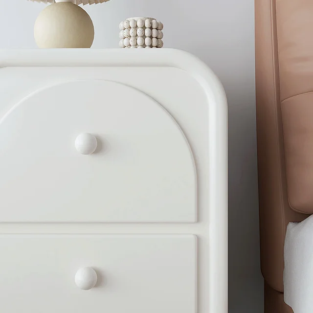 Nordic Minimalist White Wooden Bedside Table, Modern Bedroom Furniture, Living Room Cream Wind Rounded Storage Cabinet, Suitable for Families or Hotels