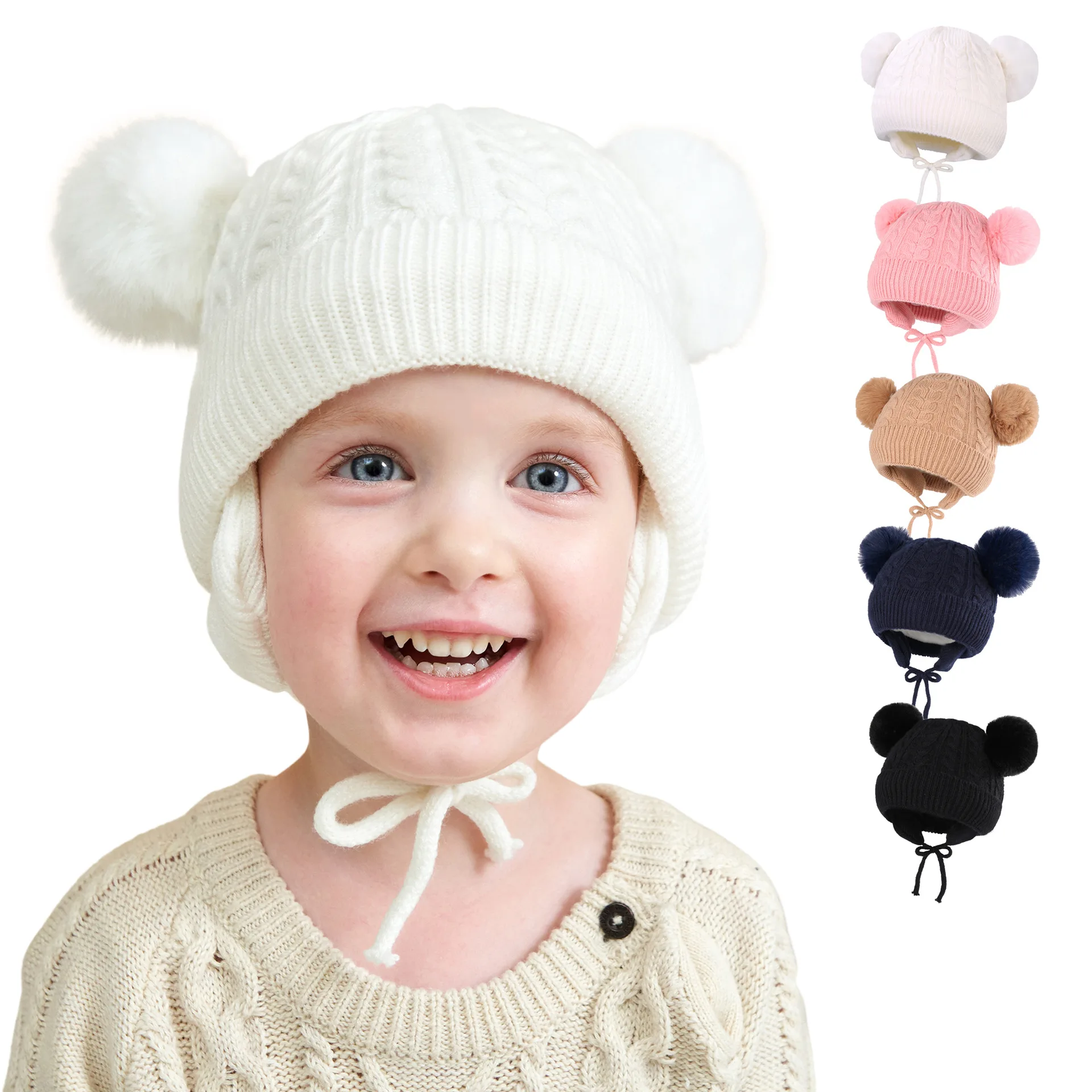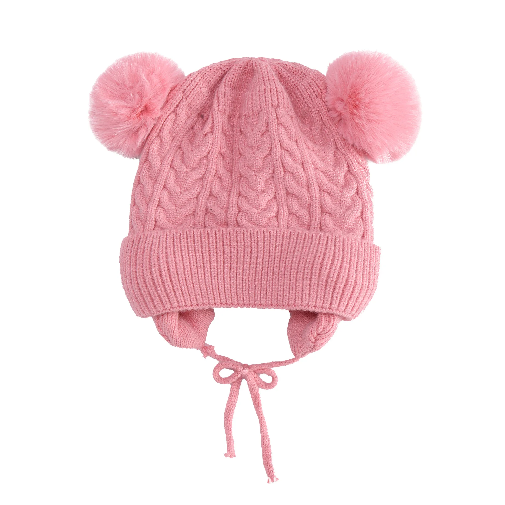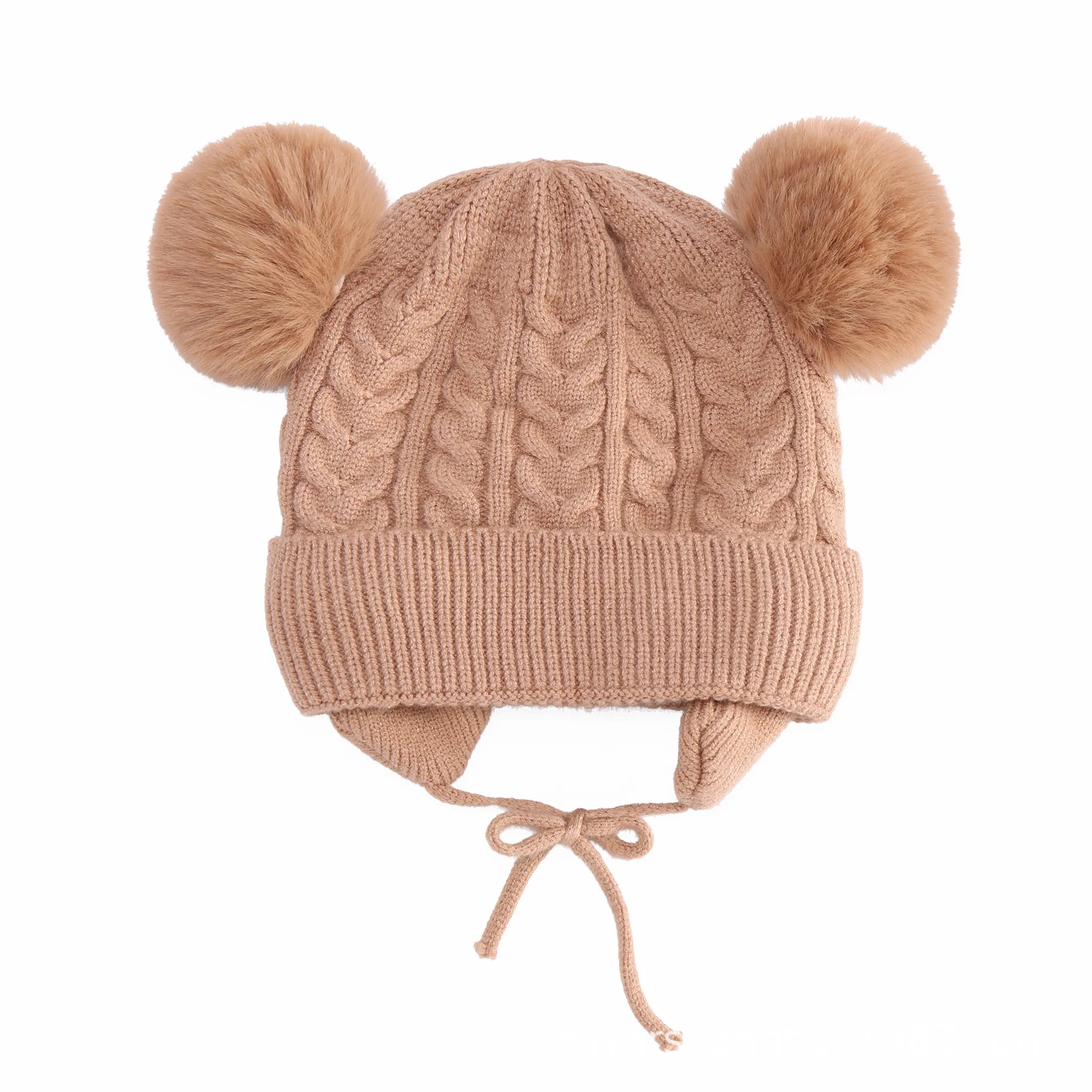 New solid color double ball twist autumn and winter children's hat plus velvet ear protection warm baby woolen hat