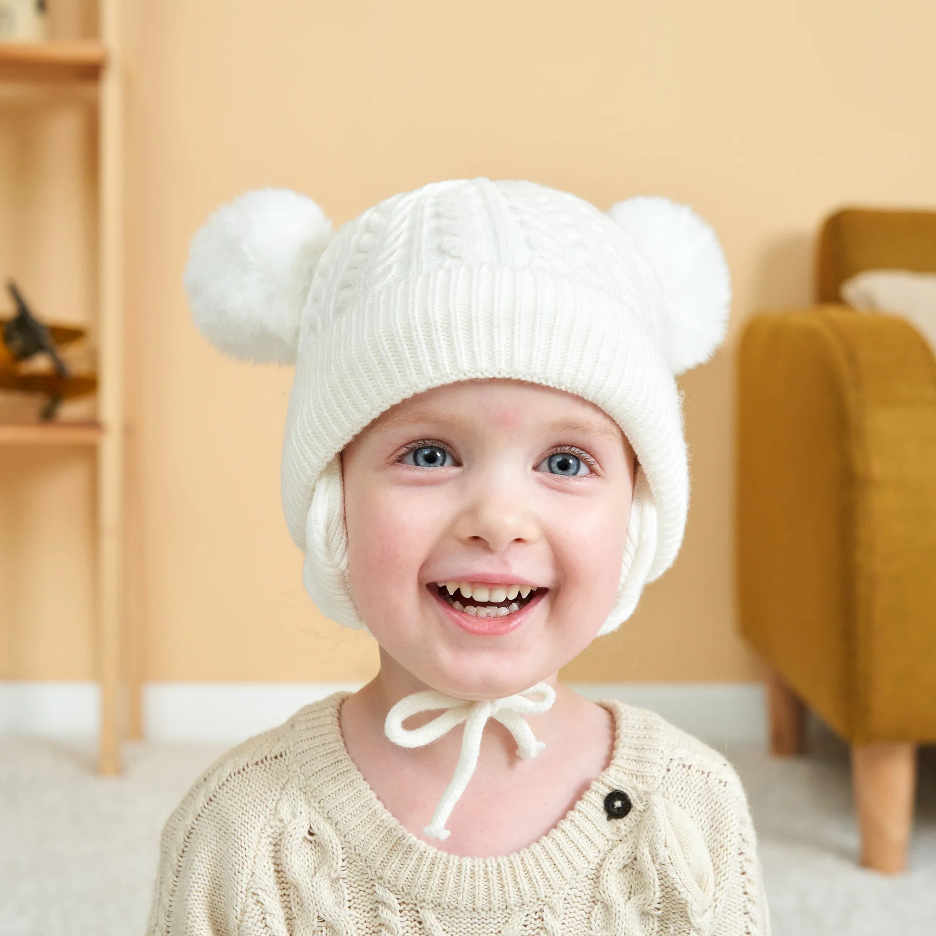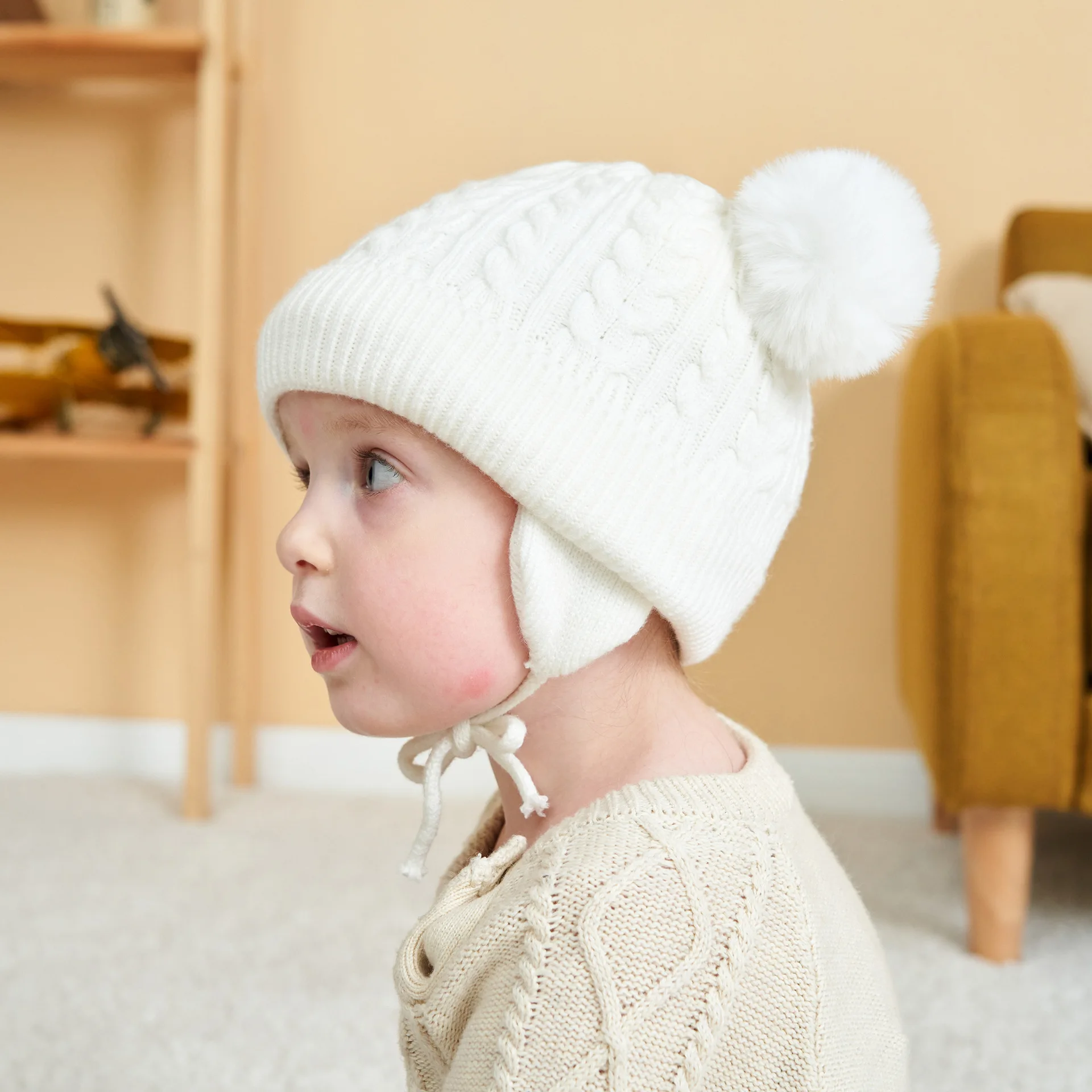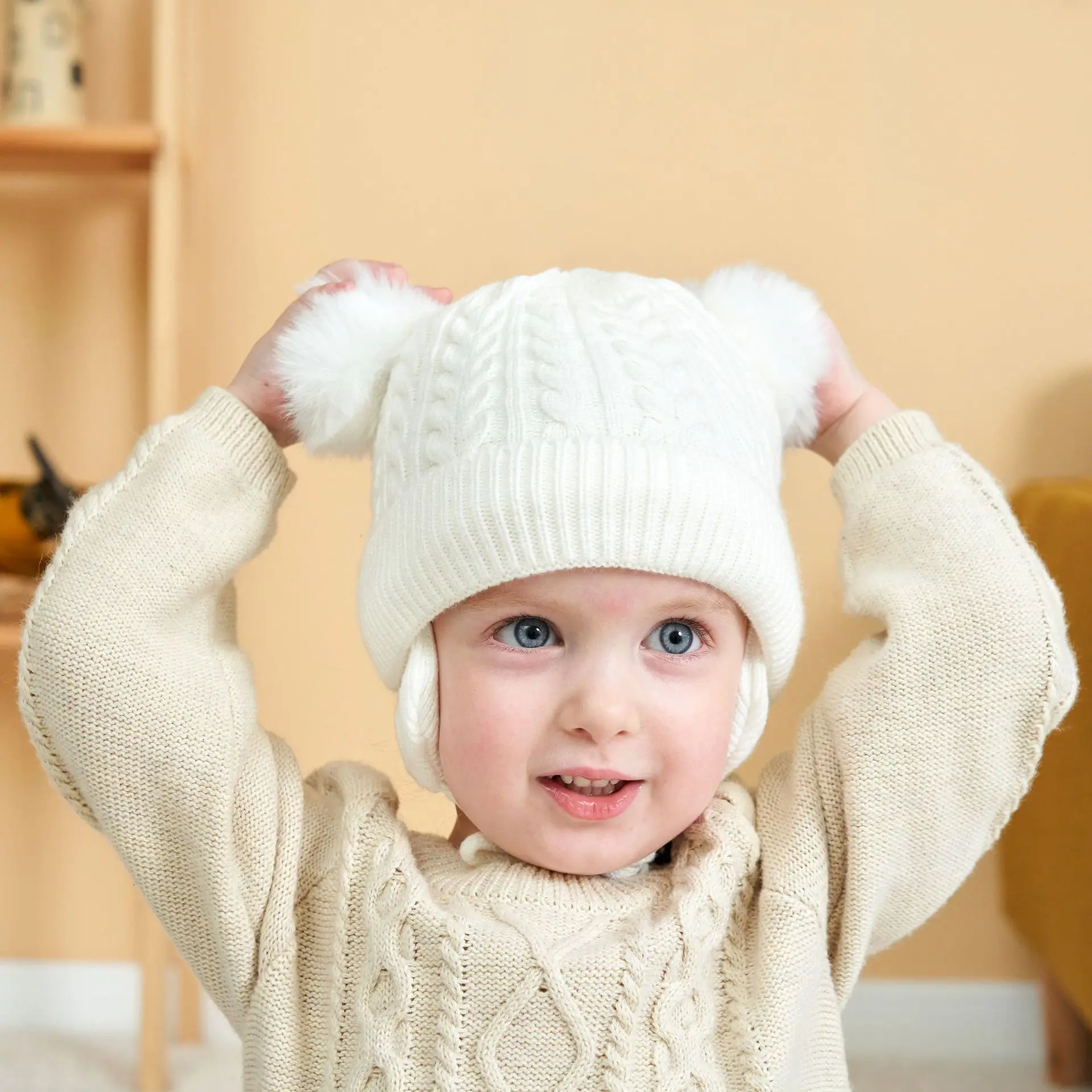 New solid color double ball twist autumn and winter children's hat plus velvet ear protection warm baby woolen hat