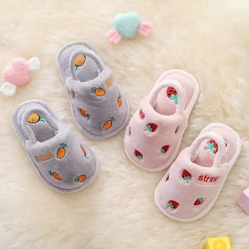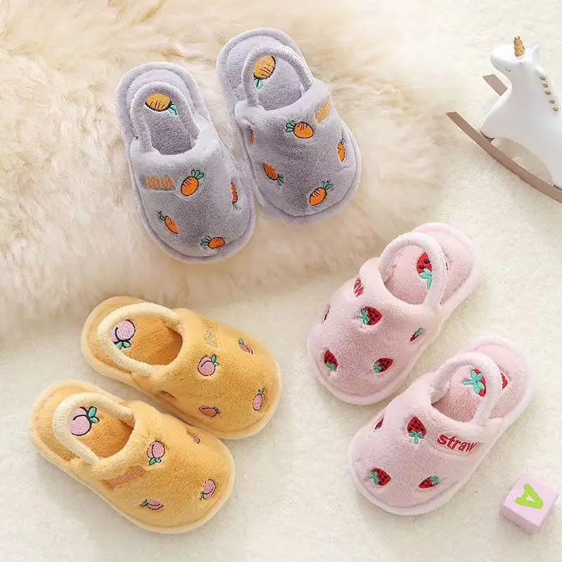 2023 Baby Autumn Winter Children Girls Fruit Print Indoor Home Fleece Fur Warm Slippers Boys Kids Non-Slip Toddler Cotton Shoes