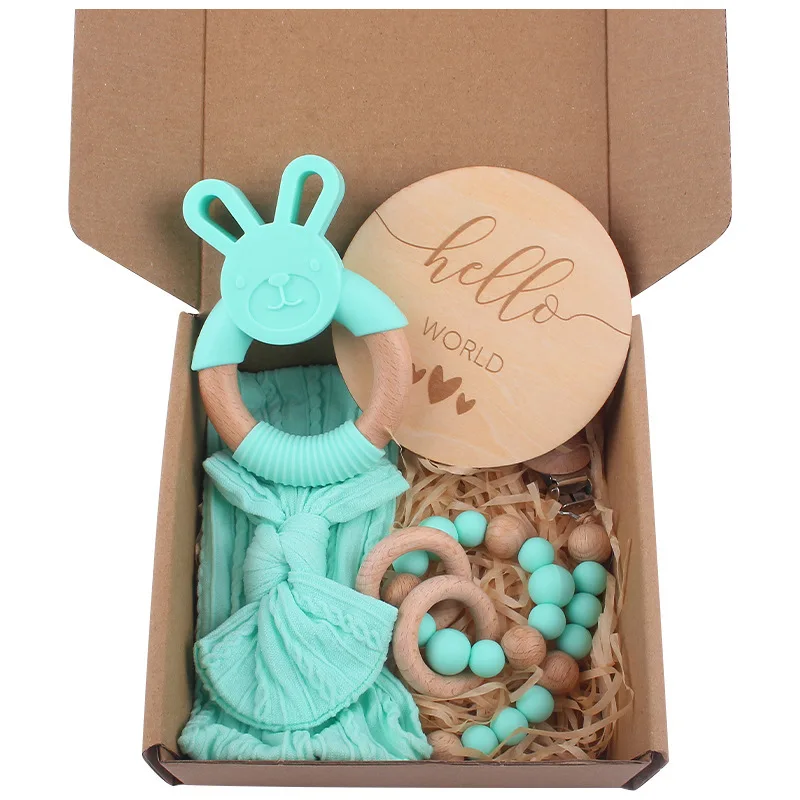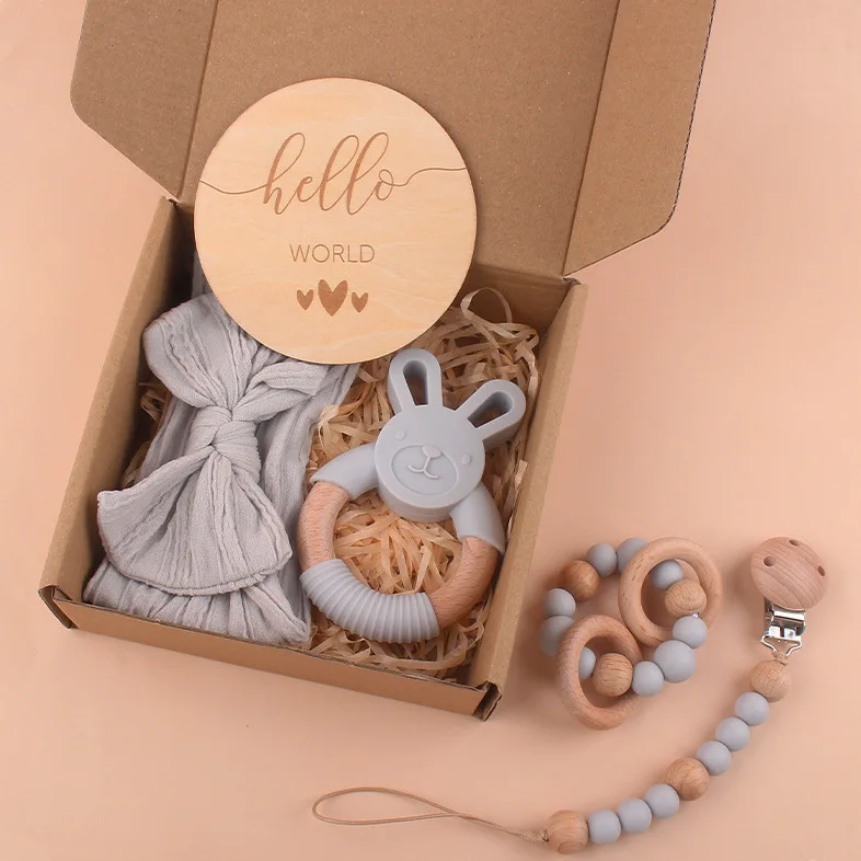 Newborn Shower Gift Set Box Souvenir Baby Cotton Blanket Teething Baby Rattle Milestone Wooden Toy Set