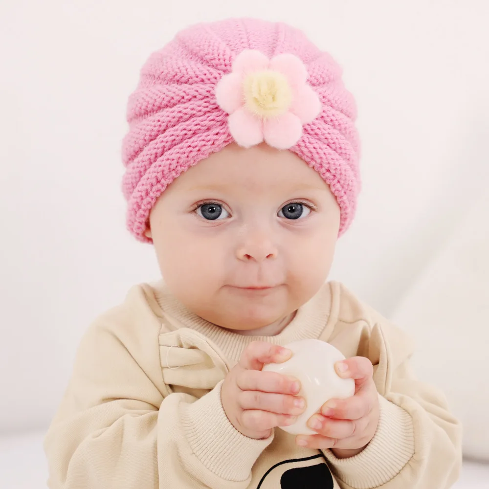 Autumn and winter children's warm knitted hat 21 colors solid color infant woolen large flower pullover hat