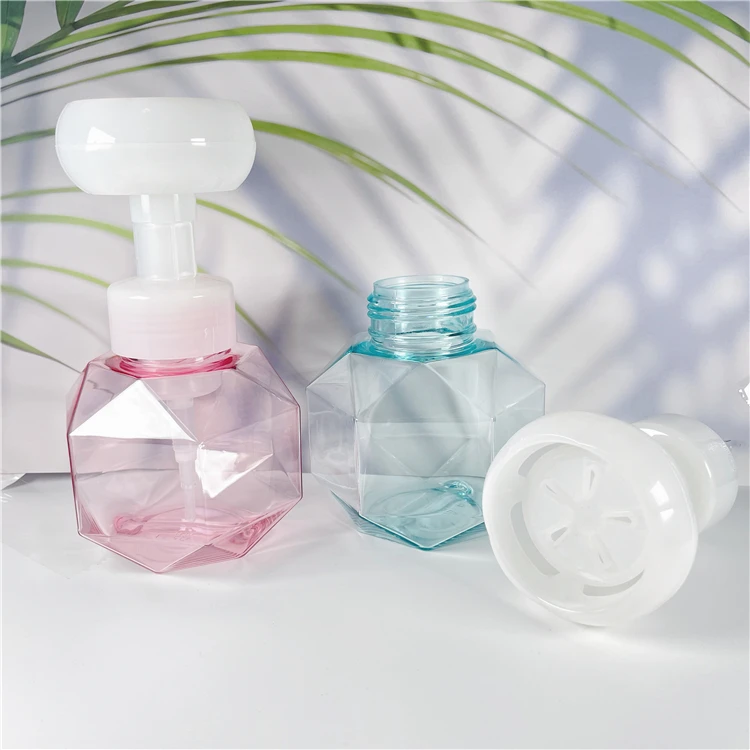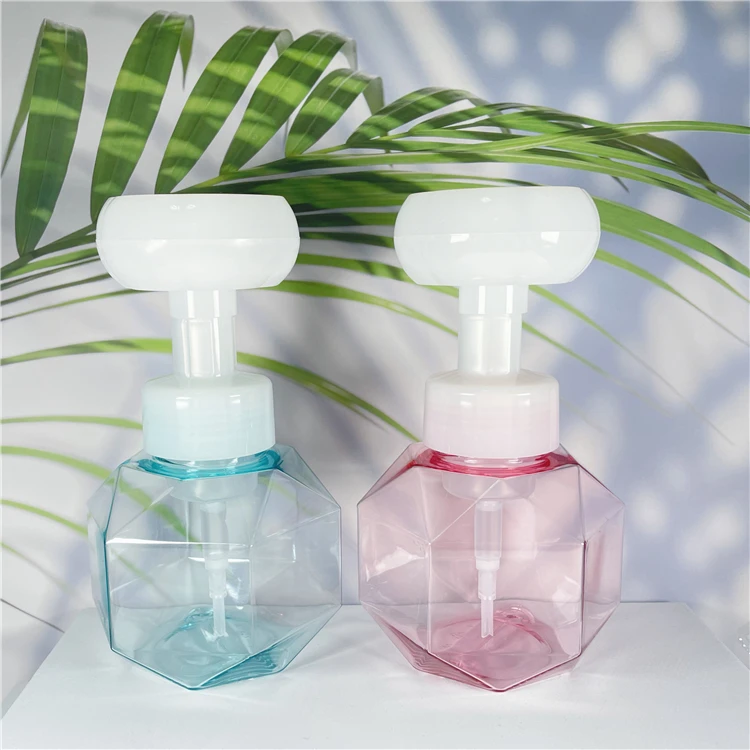 300ml Pink green color Irregular shape hand wash cleaning plastic bottle with flower pump