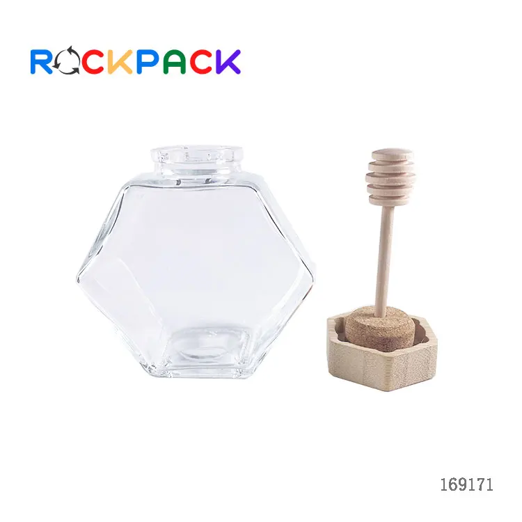 220ml 380ml Hexagon food storage container glass honey jar with wooden mixing rod