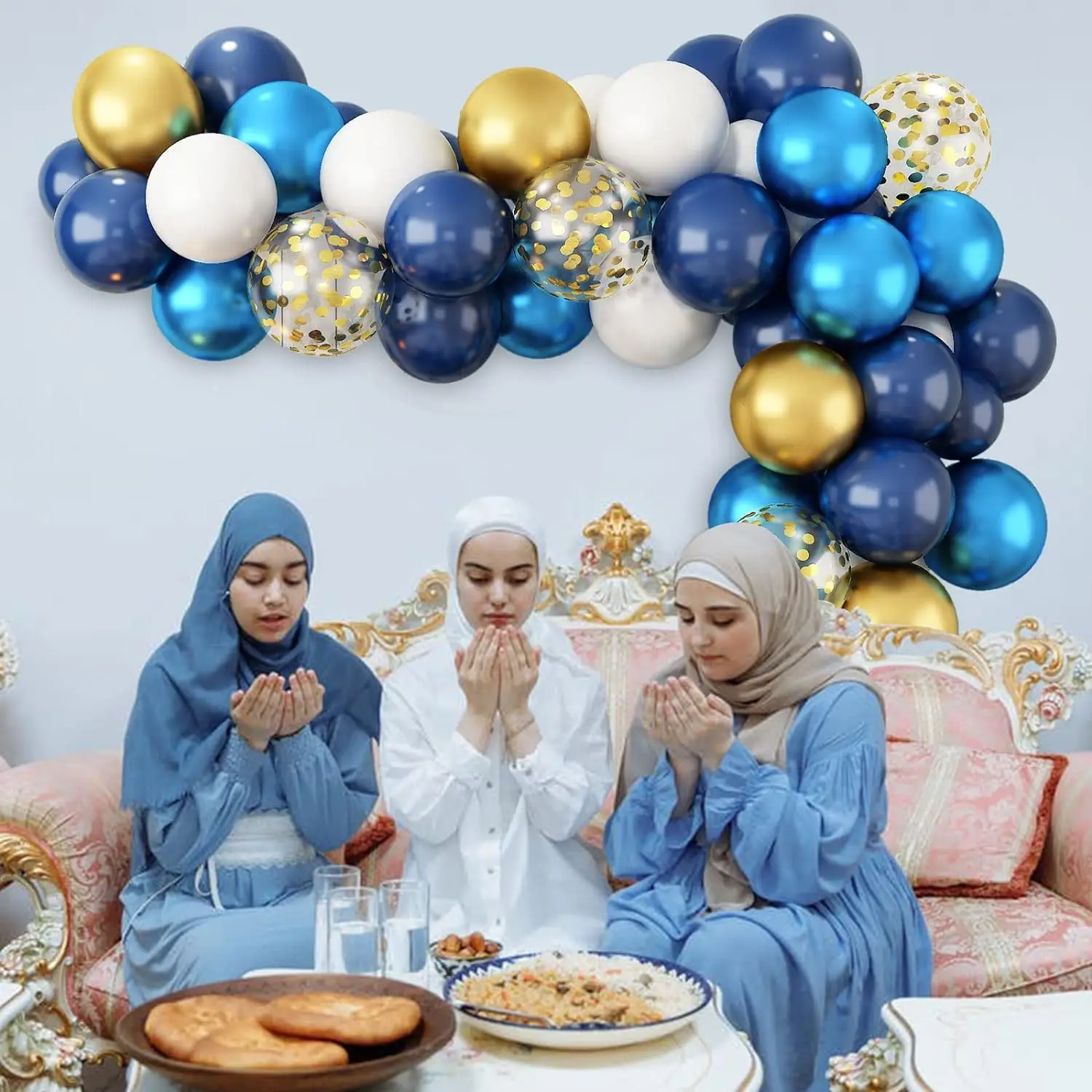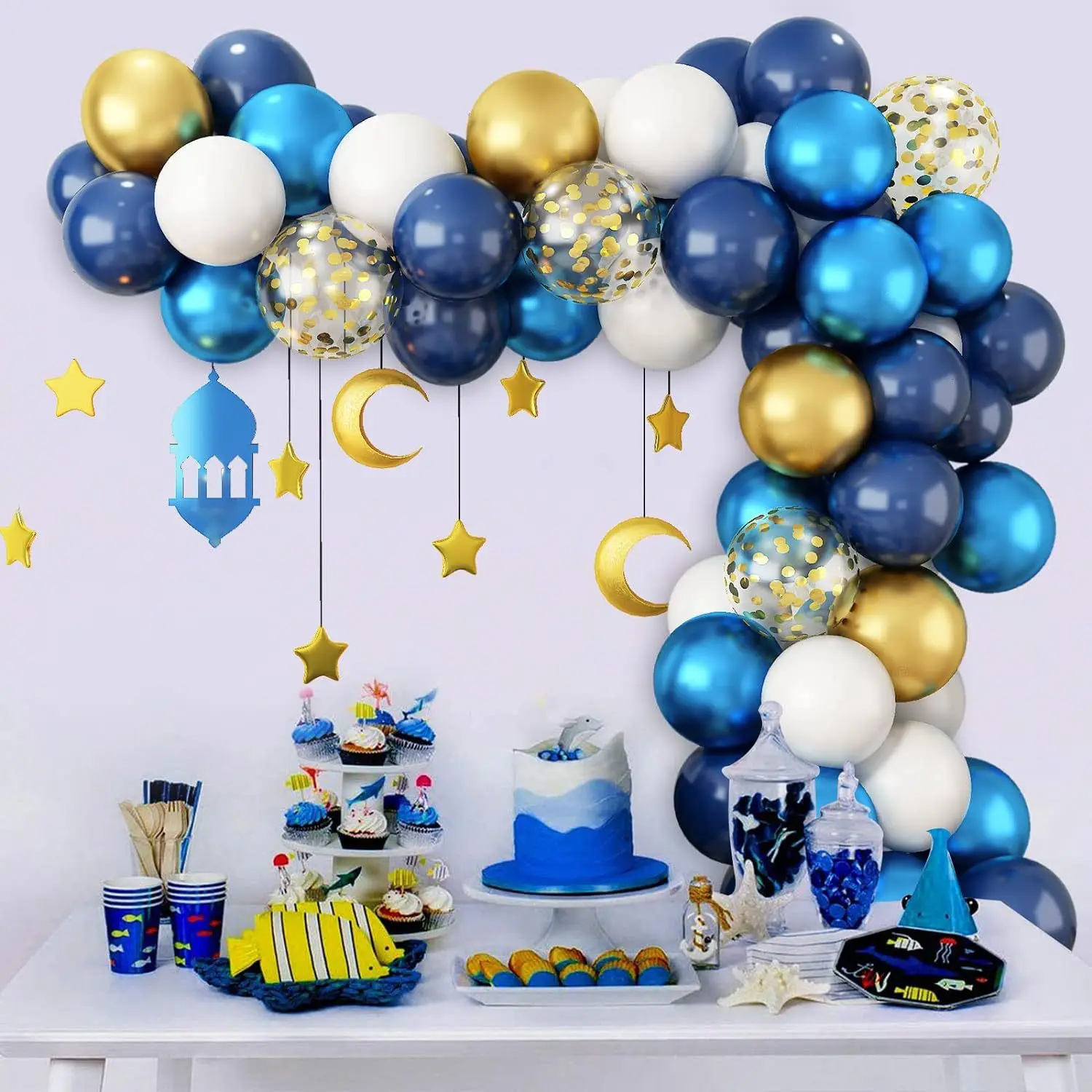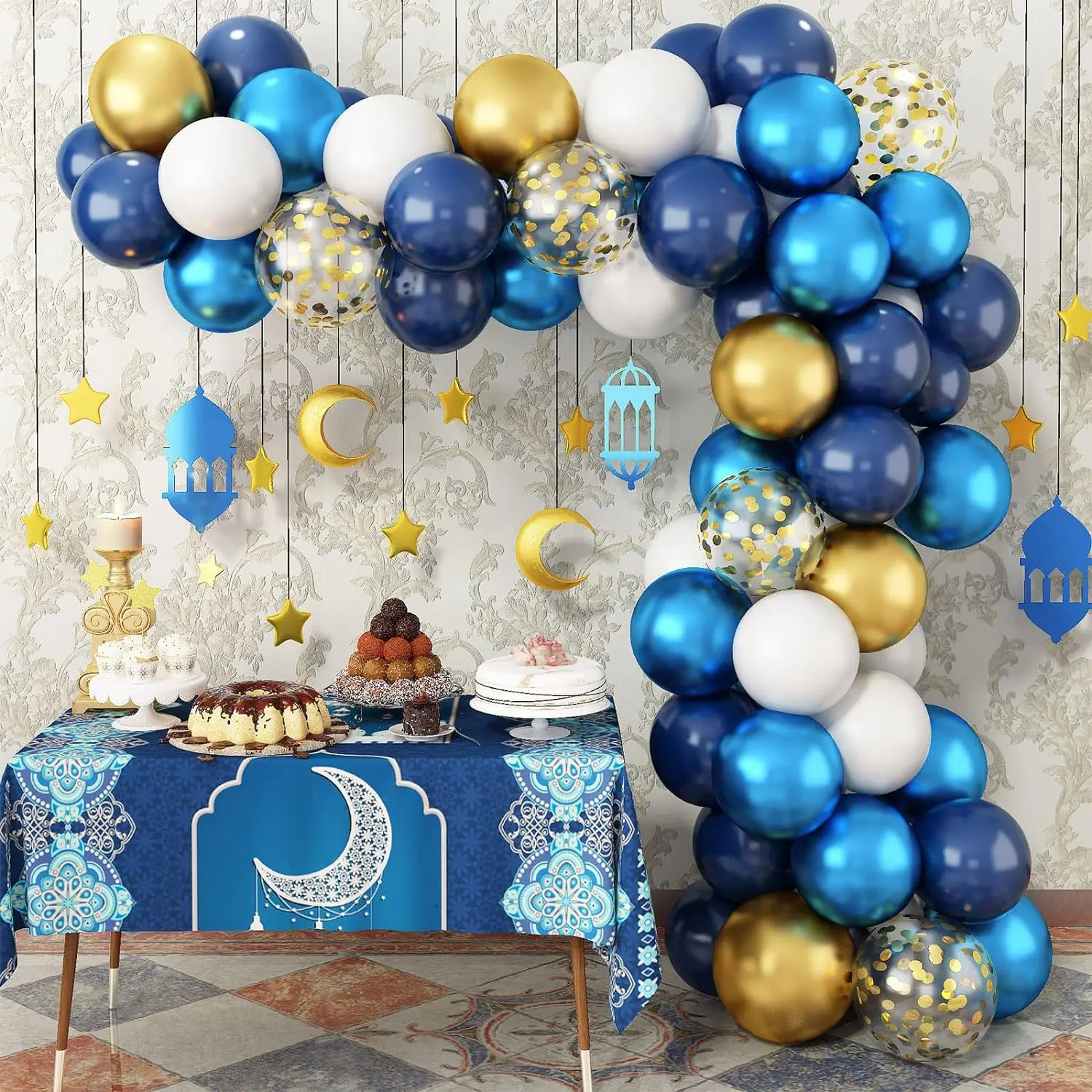 60 pcs Eid Mubarak Decorations Blue Ramadan Mubarak Balloon Arch Kit Muslim Ramadan Backdrop Background Balloons Garland Sets