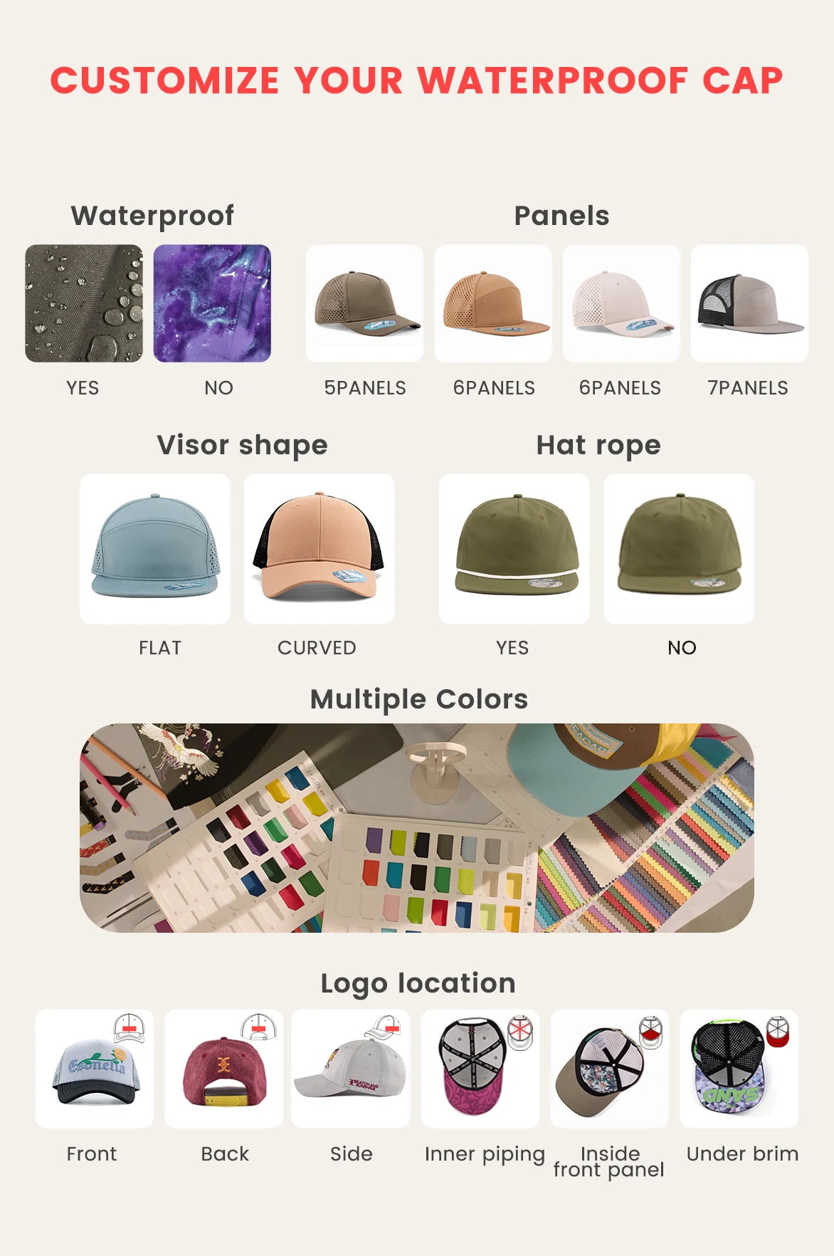 1.Product Name | High Quality Custom 5 Panel Rubber Pvc Logo Rope Baseball Cap,Waterproof Laser Cut Hole Perforated Hat,Performance golf Hat | ||