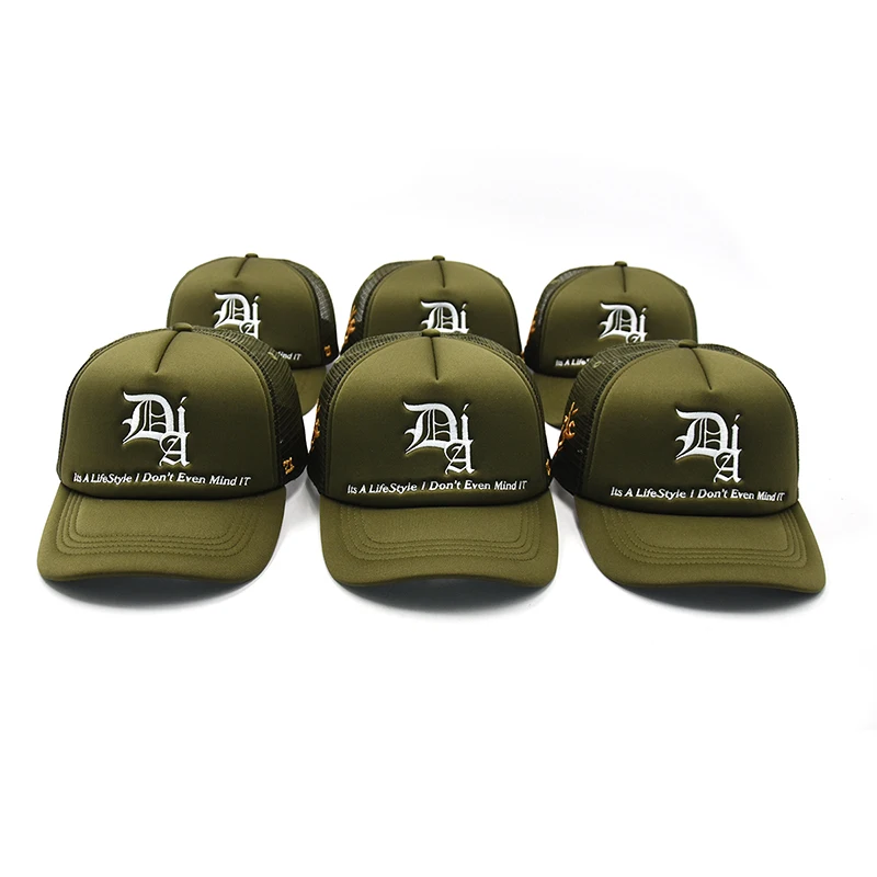 1.Product Name | Wholesale High Quality Army Green 5 Panel trucker foam caps Custom Embroidery Logo Foam Mesh trucker Caps Hat | ||
