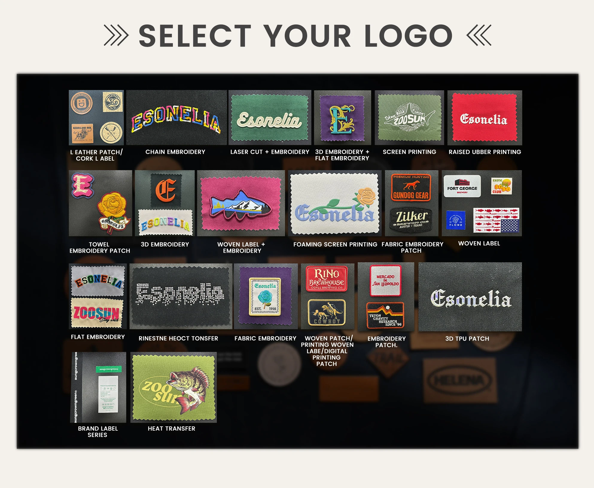 7.Logo and Design | embroidery, custom | Printing,Heat transfer printing,Applique Embroidery,3D embroidery leather patch, woven patch, metal patch, felt applique etc. | |