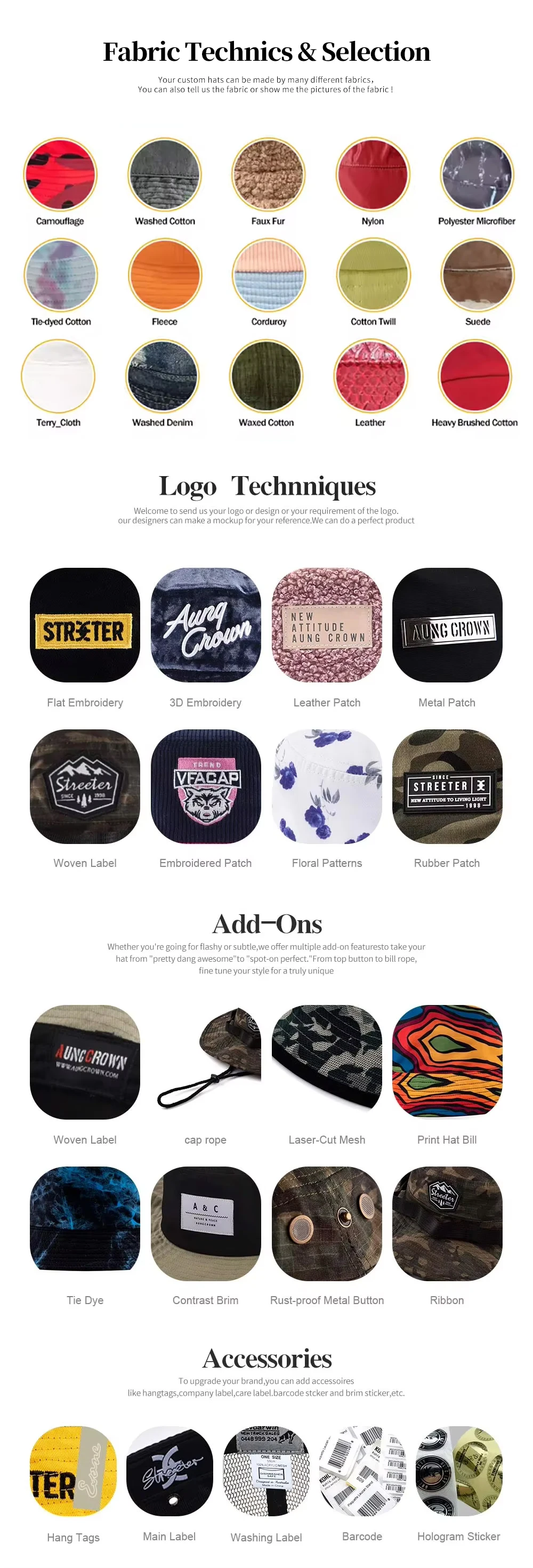 5.Logo and Design | custom | Printing,Heat transfer printing,Applique Embroidery,3D embroidery leather patch, woven patch, metal patch, felt applique etc. | |