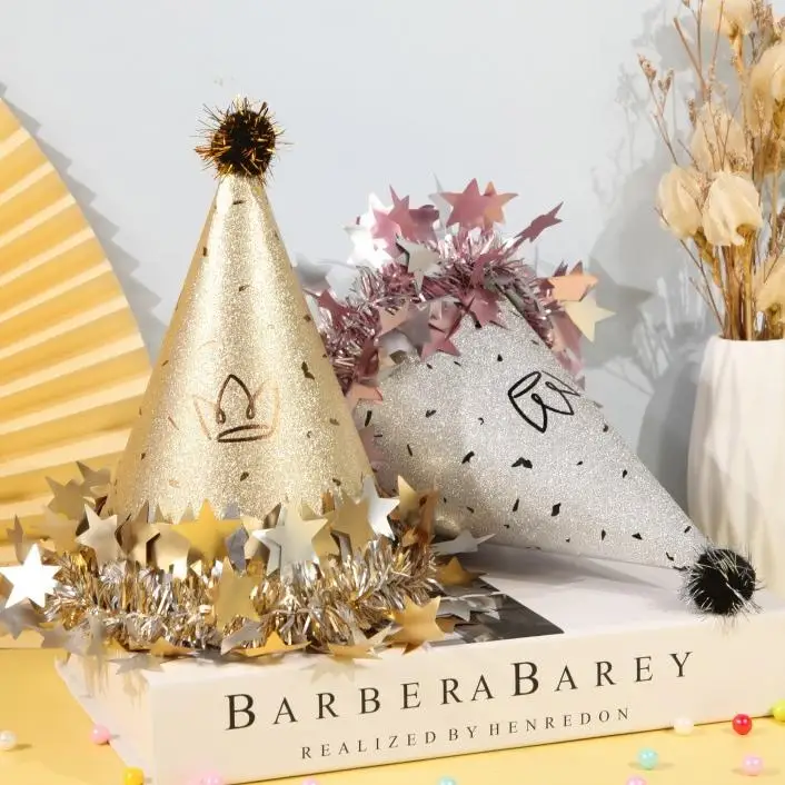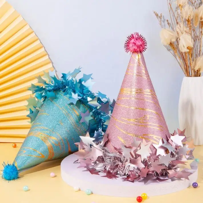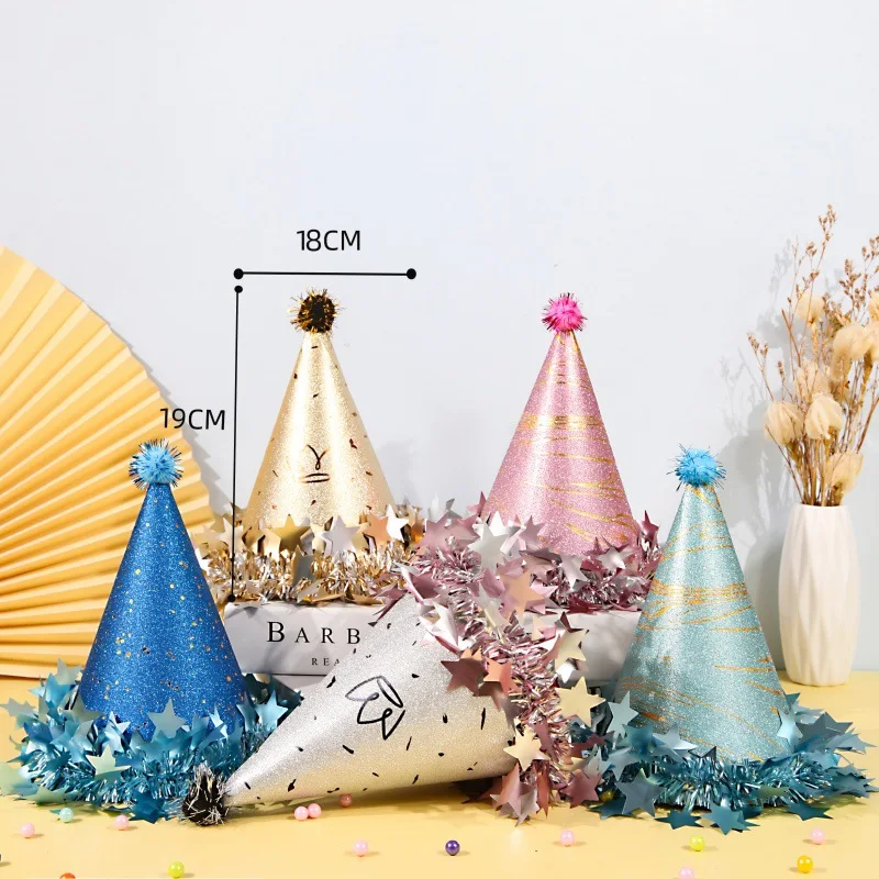 Adult Baby Cake Party Decoration Pom-Pom Star Rimmed Birthday Hat with Frosted Pearl Pointed Hat Photo Booth Props