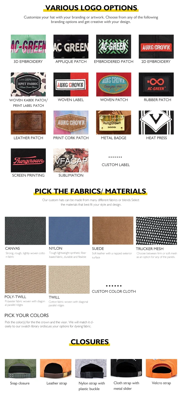 7.Logo and Design | custom | Printing,Heat transfer printing,Applique Embroidery,3D embroidery leather patch, woven patch, metal patch, felt applique etc. | |