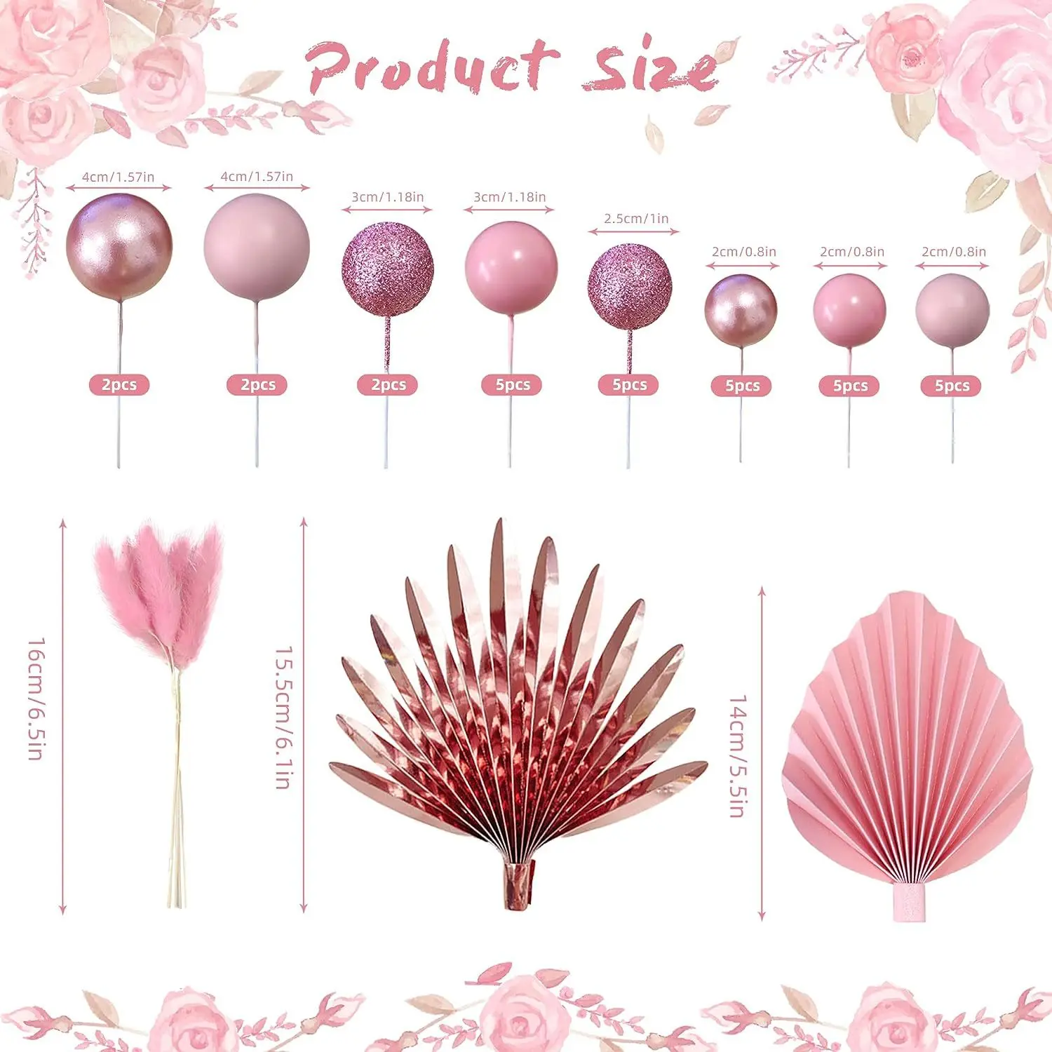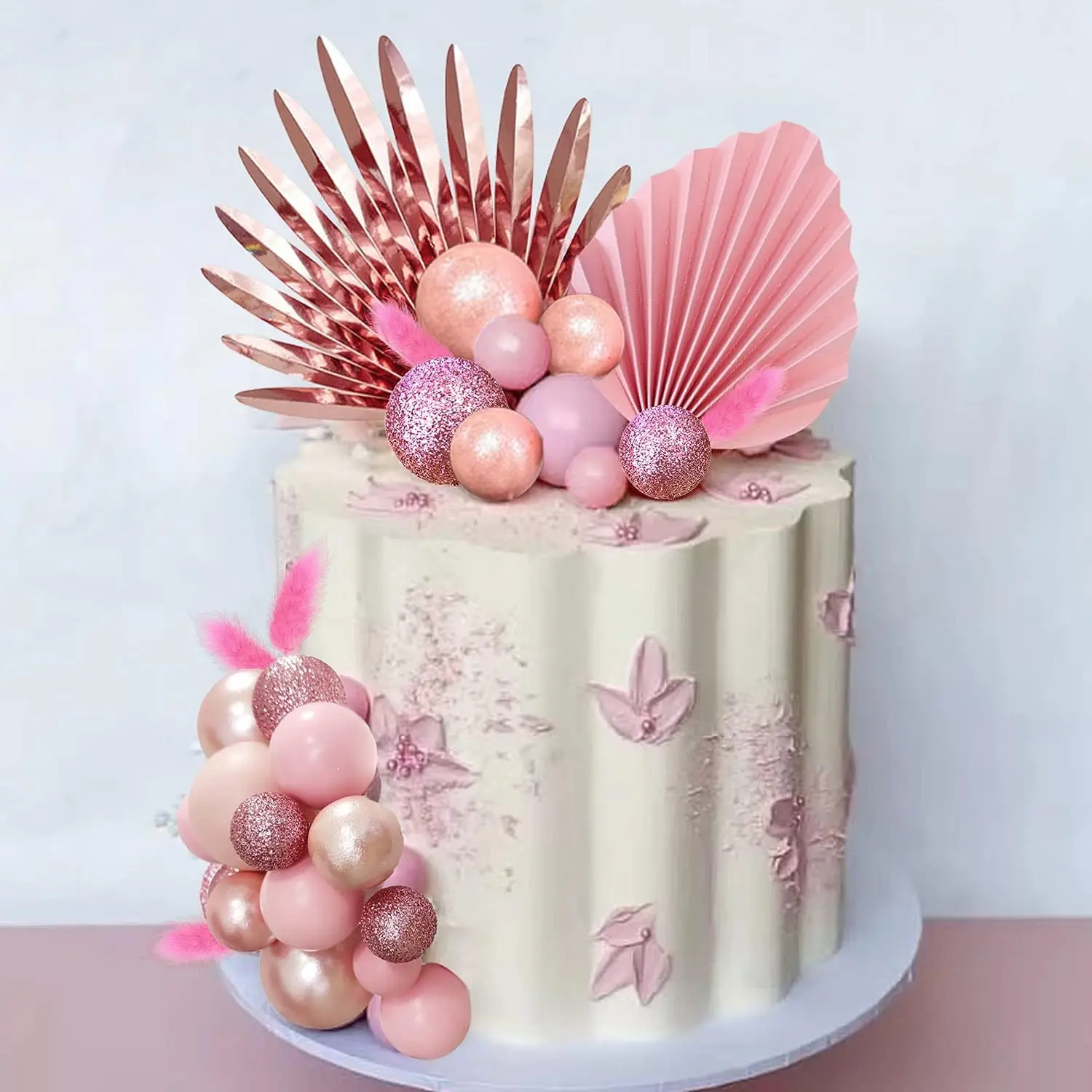 Rose Gold Cake Topper Set Rose Gold Paper Fan Foam Ball Pink Cake Insert Girl Birthday Party