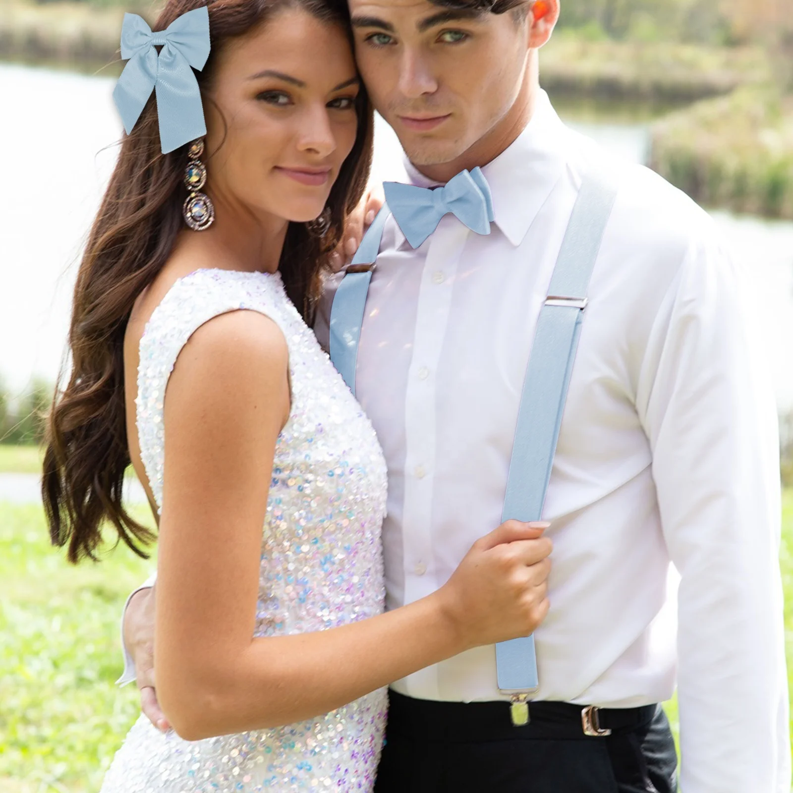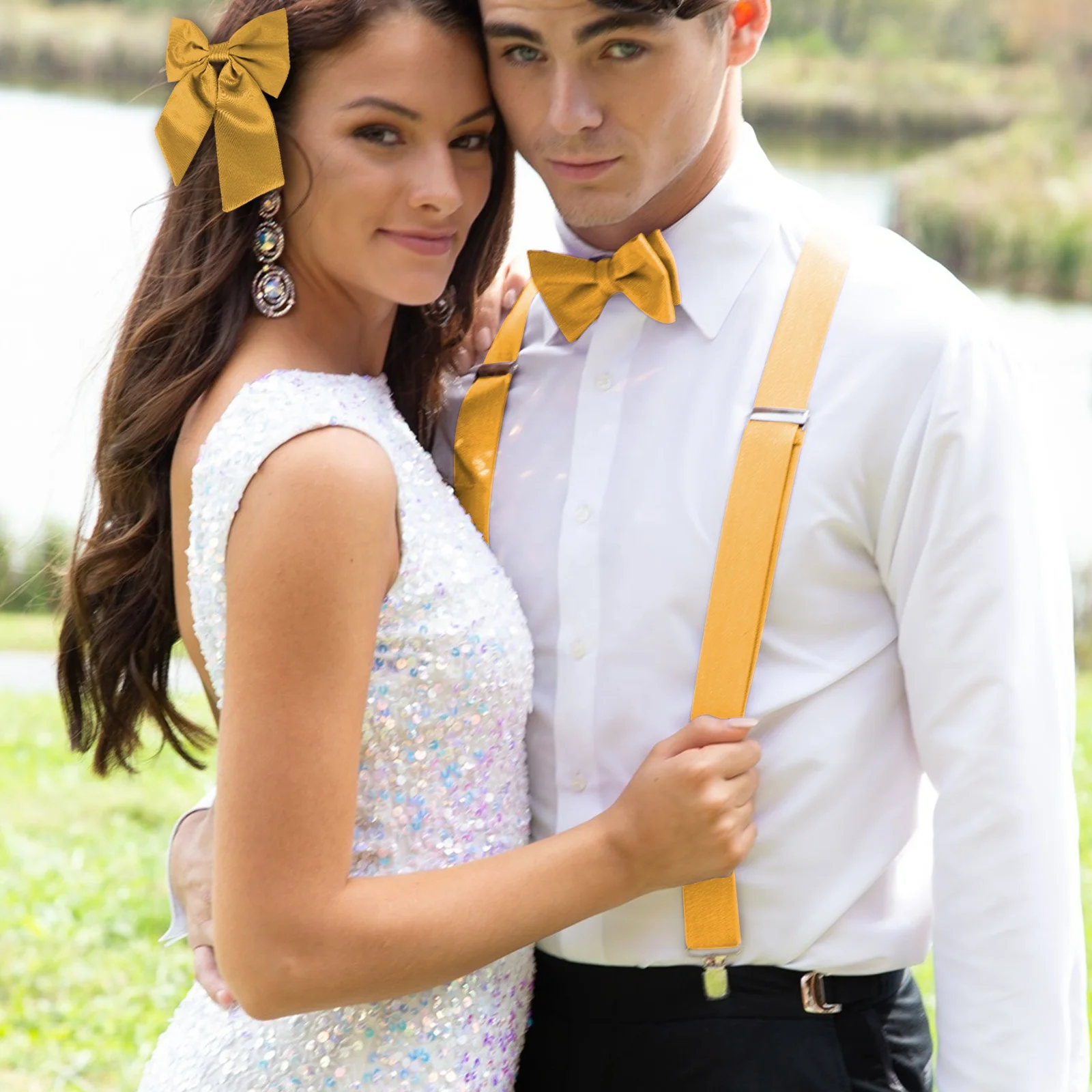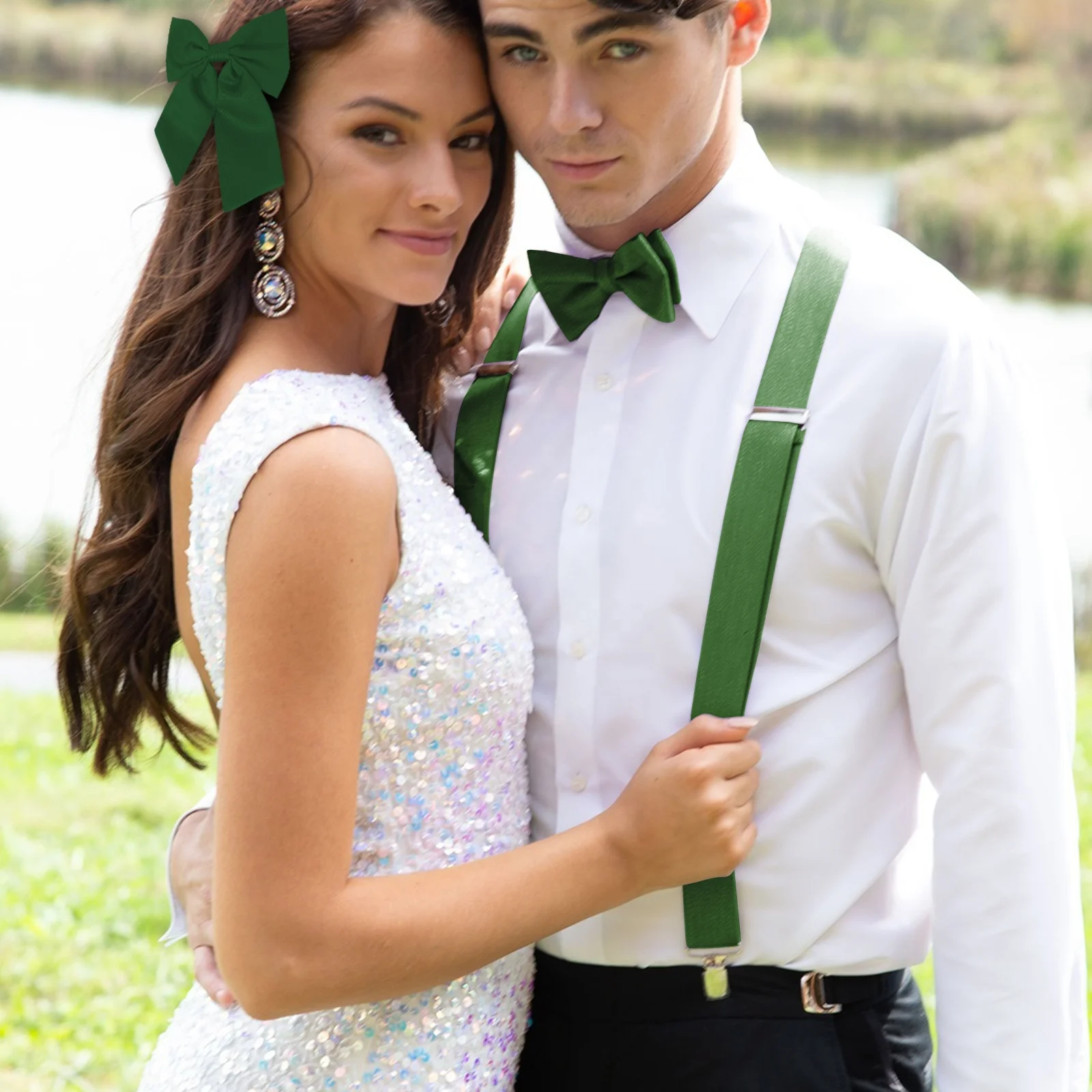 Solid Color Men's 4pcs Leather Suspender Paisley Adjustable Brace Handkerchief Hair Accessories Bowtie Set 3 Clips Wedding Party