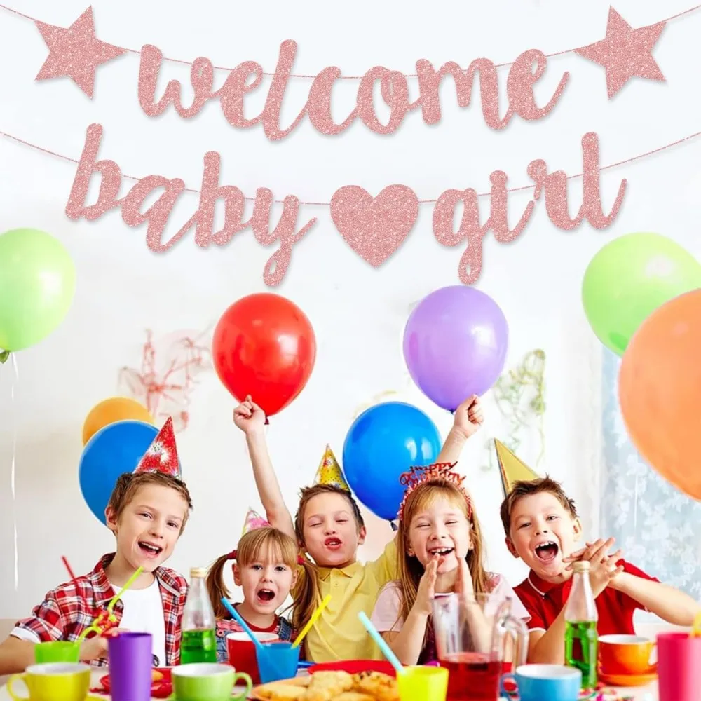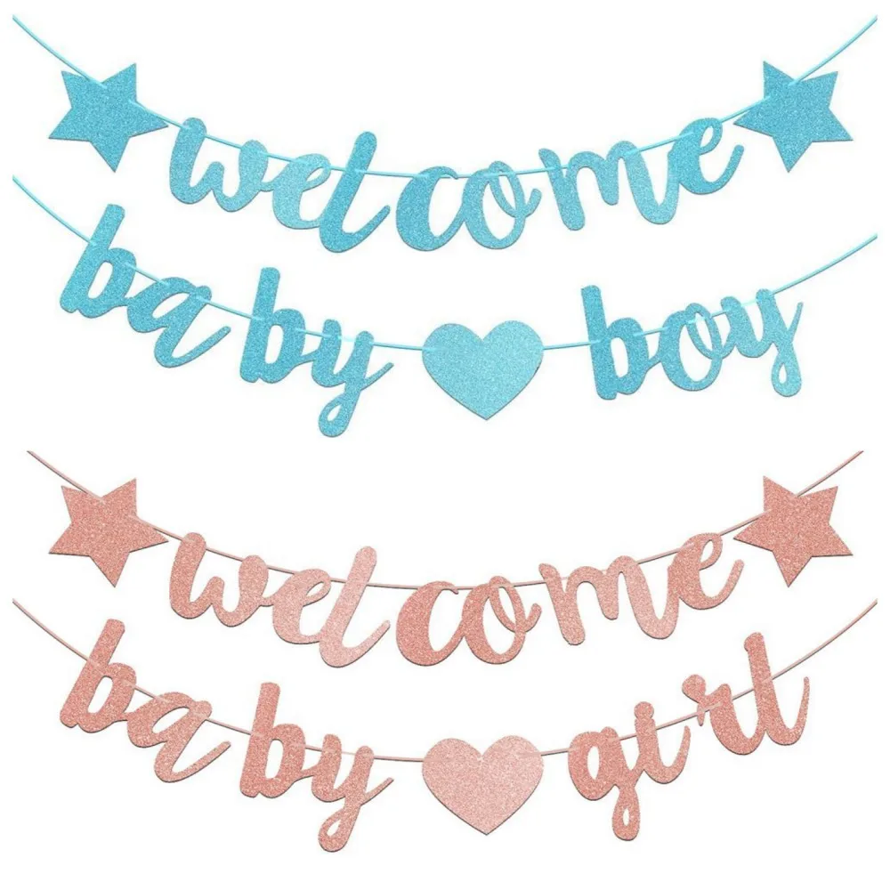 Welcome Baby Boy Baby's First Year Glitter Pink Letter Conjoined Flag Baby Gender Reveal Party Decoration