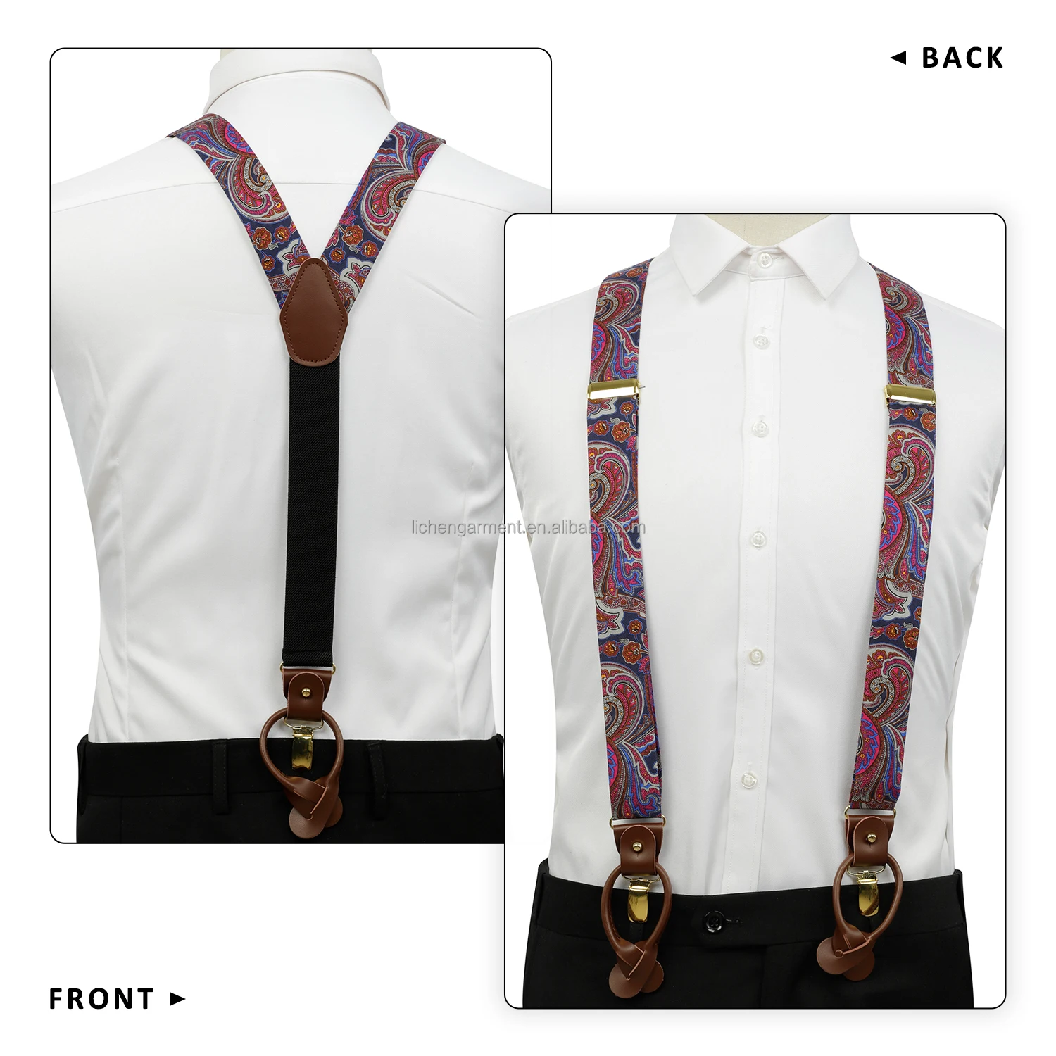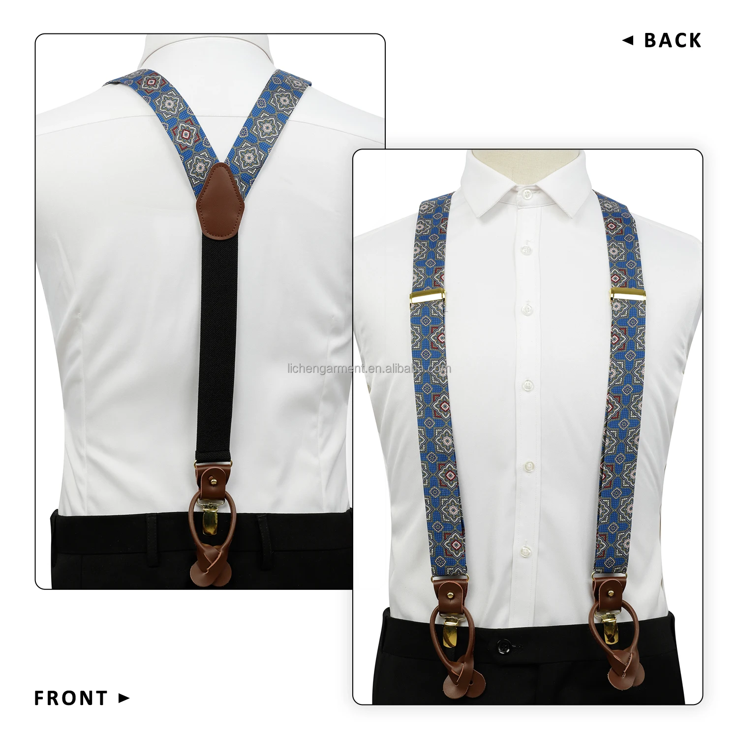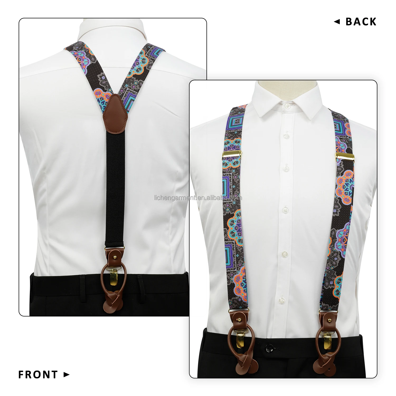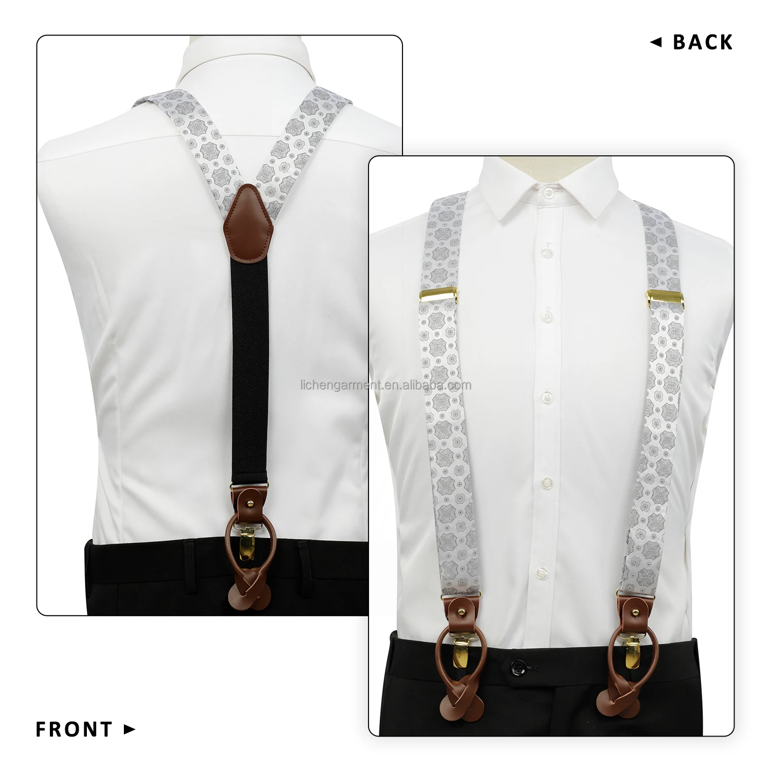Silk Jacquard Fabric Mens Adjustable Fabric End Suspenders Y-Back Elastic Tuxedo Suspenders with Heavy Duty Leather Buttons End