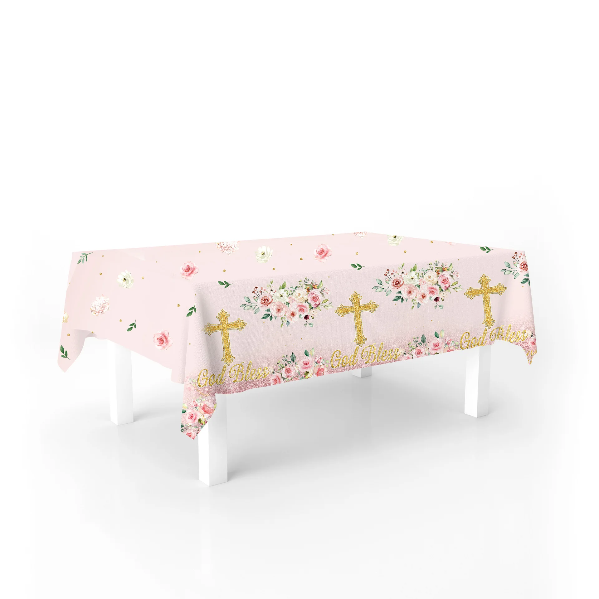 Cross God Bless Theme Pink Flowers Birthday Baby Baptism Party Disposable Party Supplies