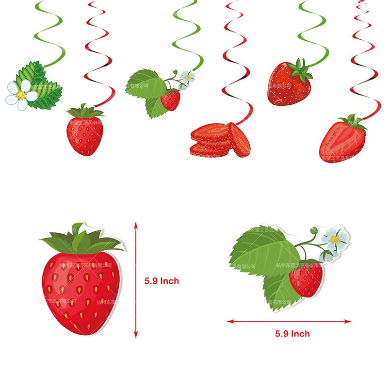 Each set includes | Strawberry table set(37 pieces): 1* strawberry banner 1* cake topper 3* strawberry table 6* strawberry spiral 6* hanging cards 20* balloons (6 red, 6 pink, 4 white and 4 green) |