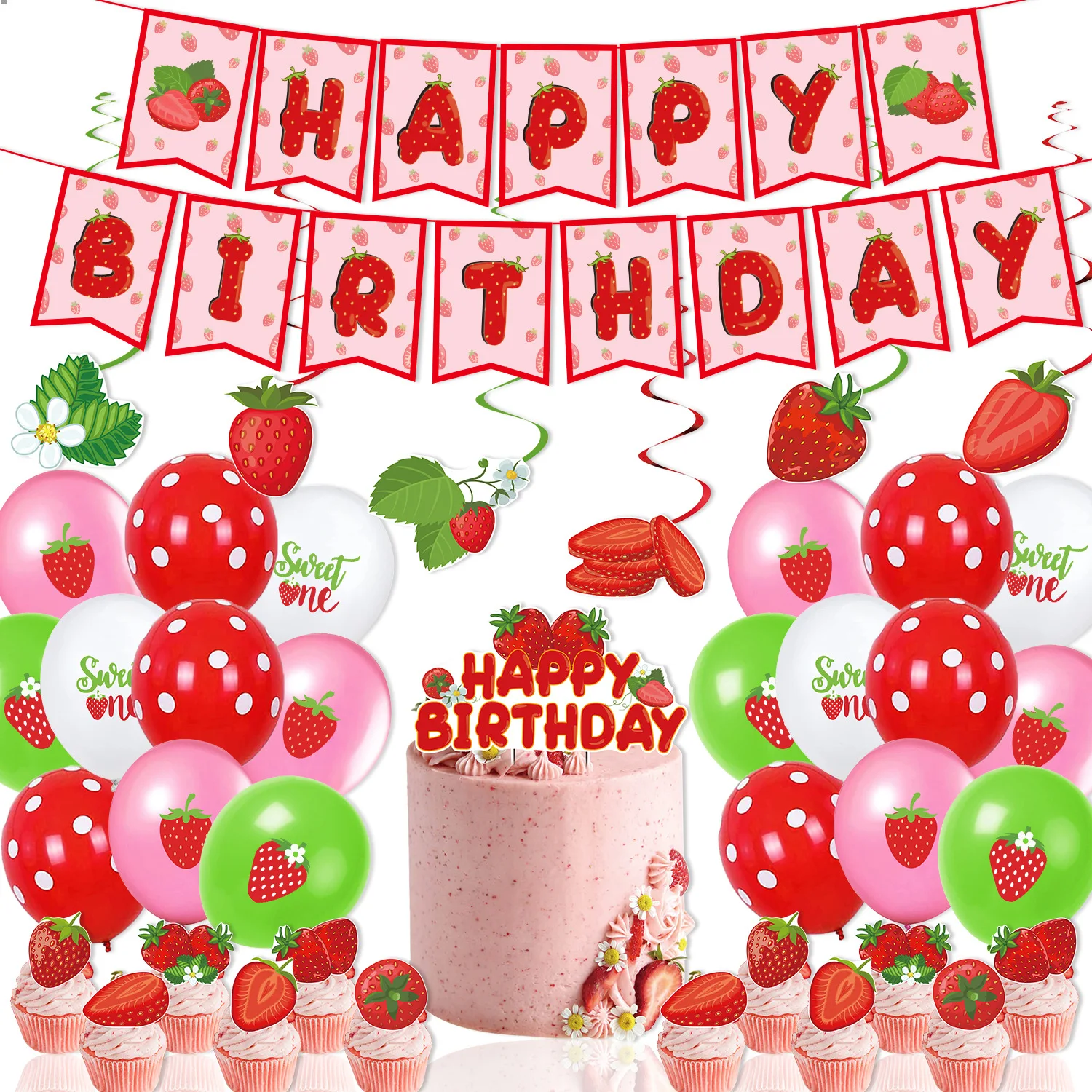 Strawberry cake topper set(46 pieces): 1* strawberry banner 1* big cake topper 12* small cake toppers 6* strawberry spiral 6* hanging cards 20* balloons (6 red, 6 pink, 4 white and 4 green) |