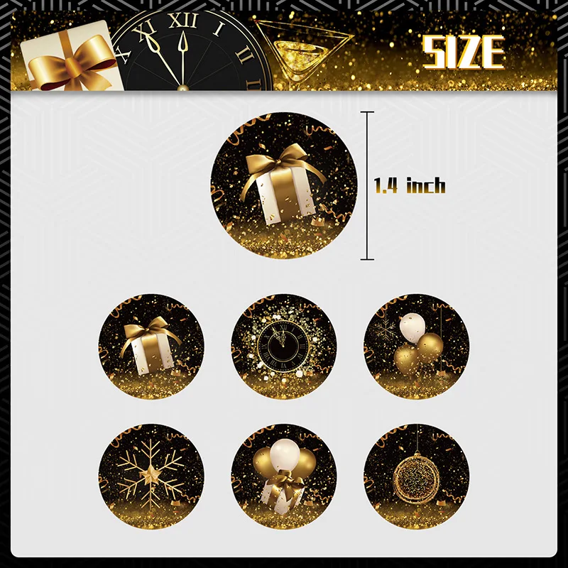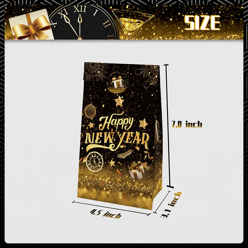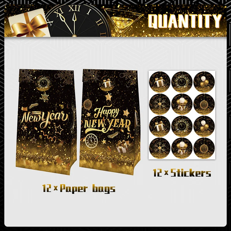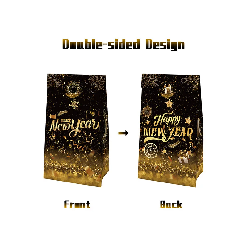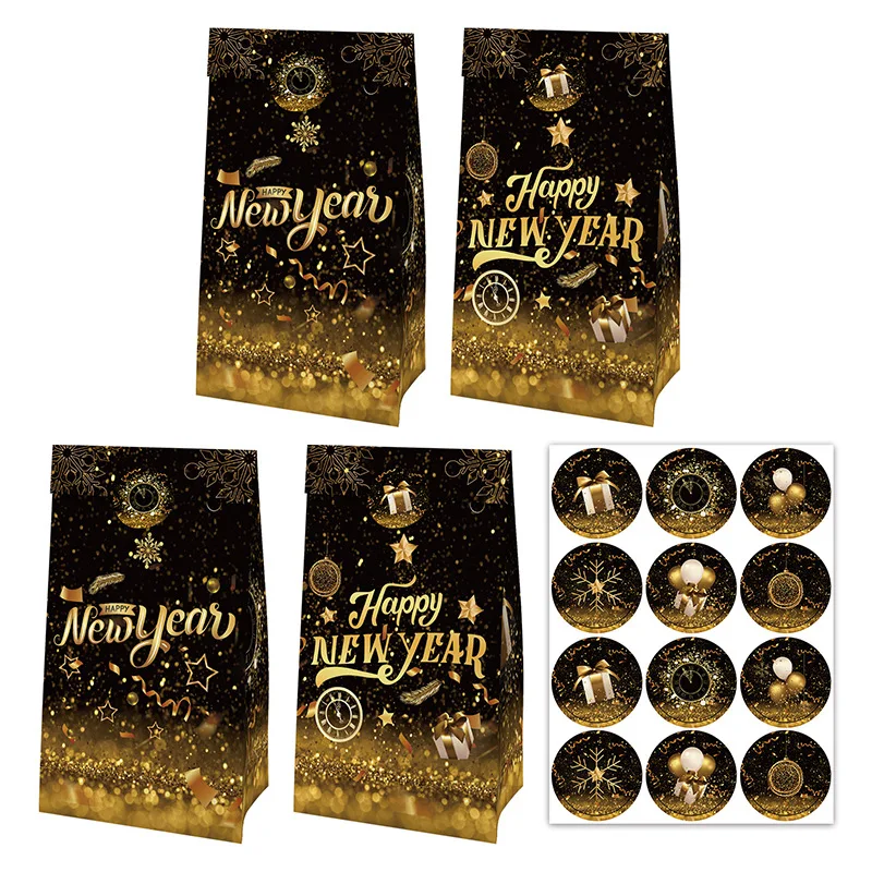 Custom New Year Theme Black Gold Gift Bag Cowhide Folding Paper Bag Sticker Party Supplies Set