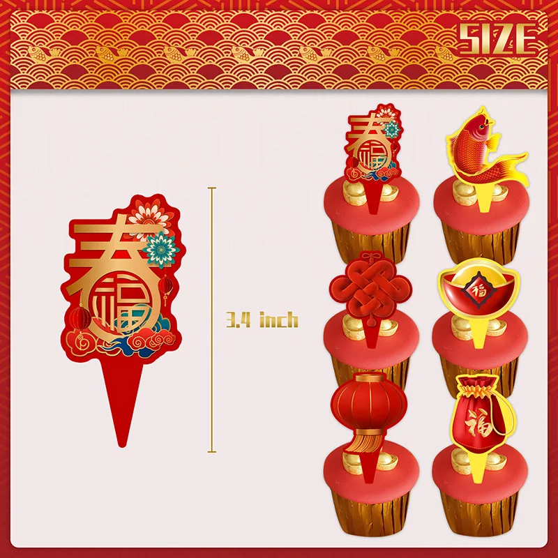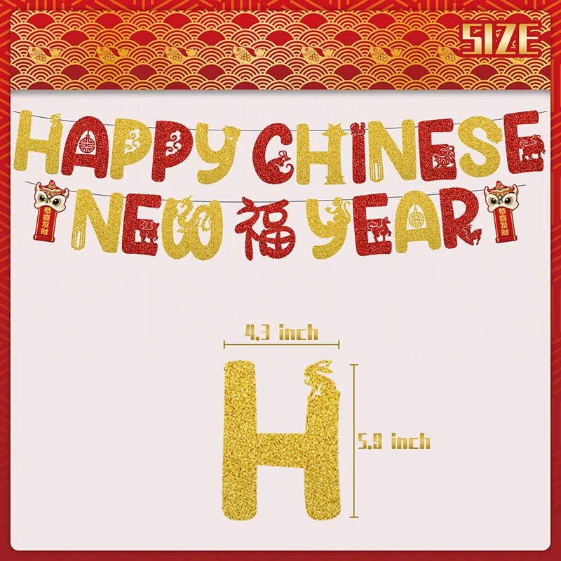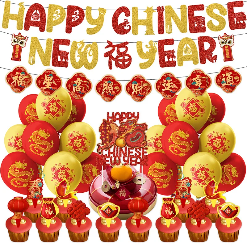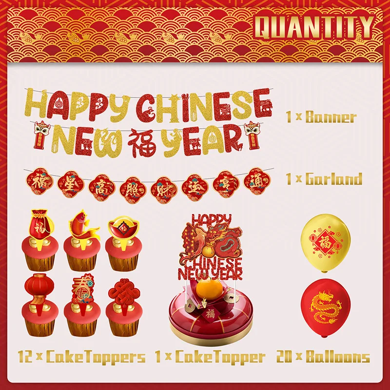 One Set Including | 33pcs: 1* NEW YEAR flag banner 1* Spring Festival pull flower 1* big topper 12* small toppers 20* latex balloons |