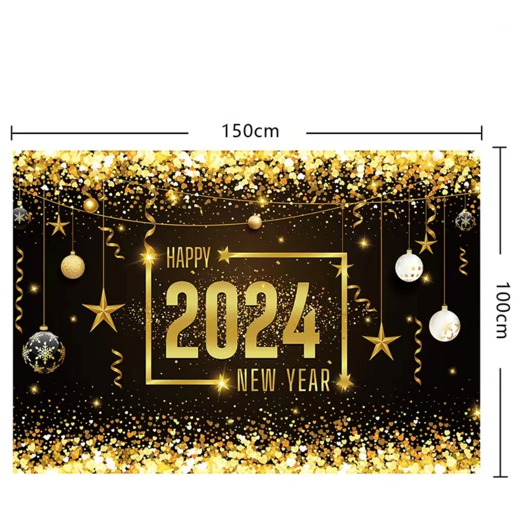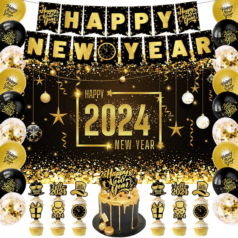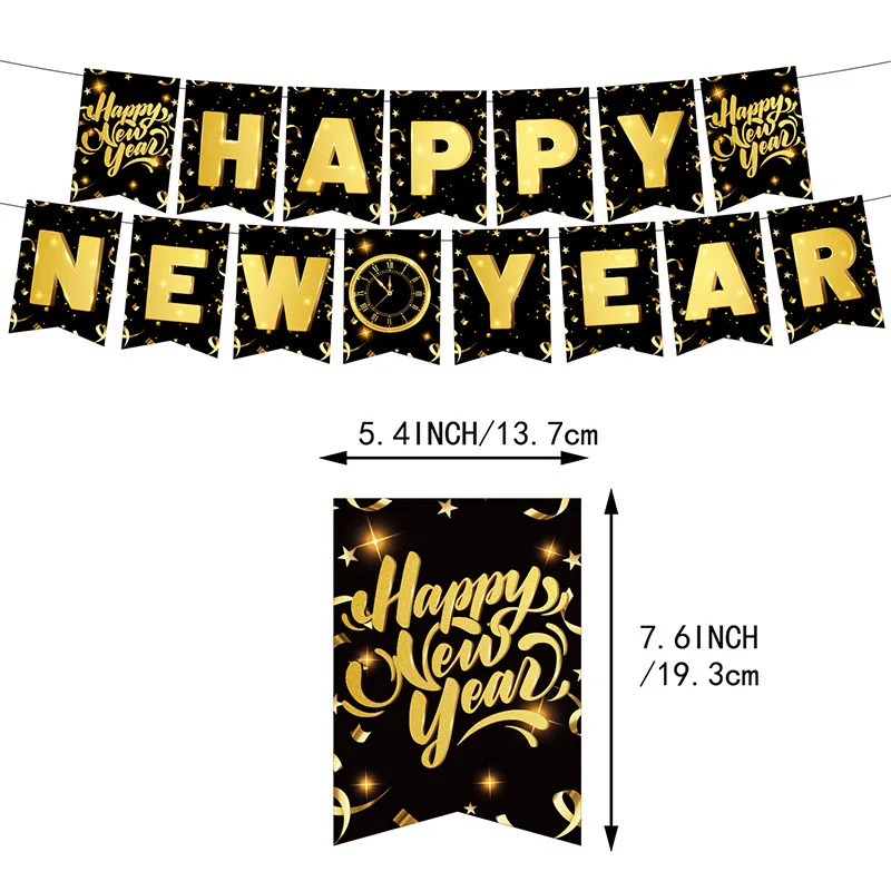 One Set Including | 33pcs: 1* NEW YEAR flag banner 1* 150×100 cm background cloth 1* Big topper 12* Small topper 18* latex balloon |
