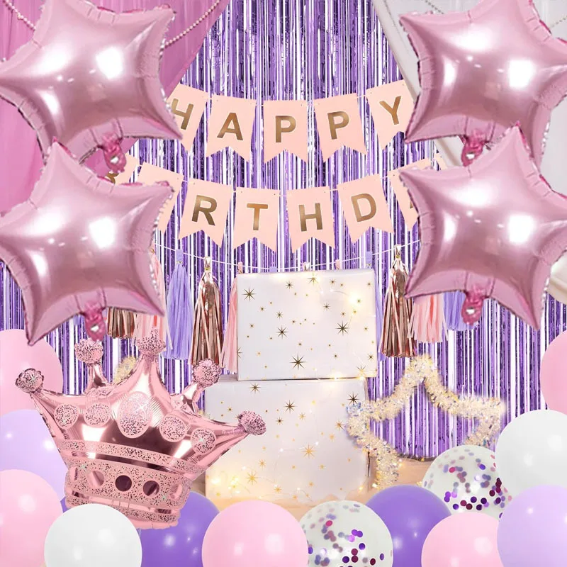 Pink Purple birthday set Happy birthday pull flag girl Ladies birthday party decoration supplies