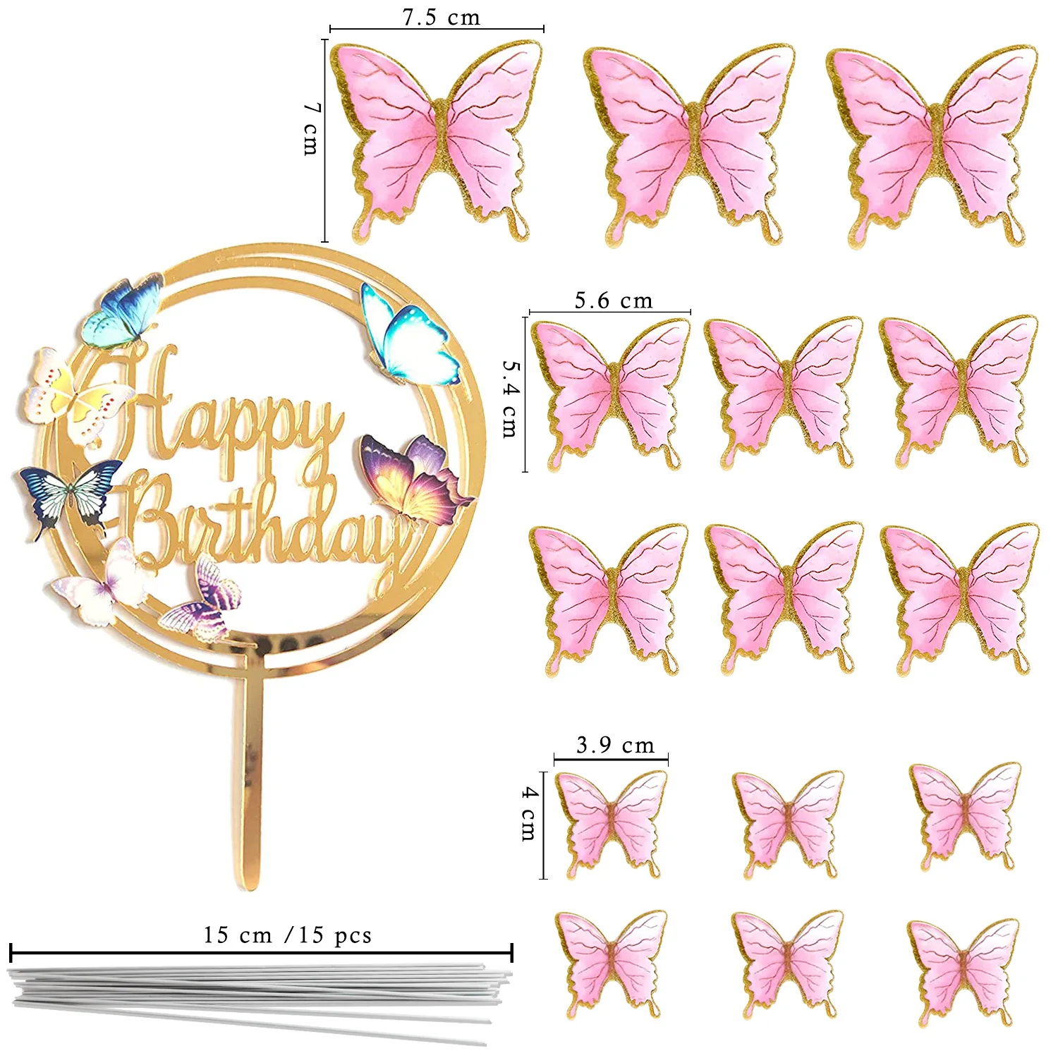 16pcs Butterfly Cake Toppers Decoration 1 Happy Birthday Cake Topper and 15pcs Rose Gold Butterfly Paper Topper