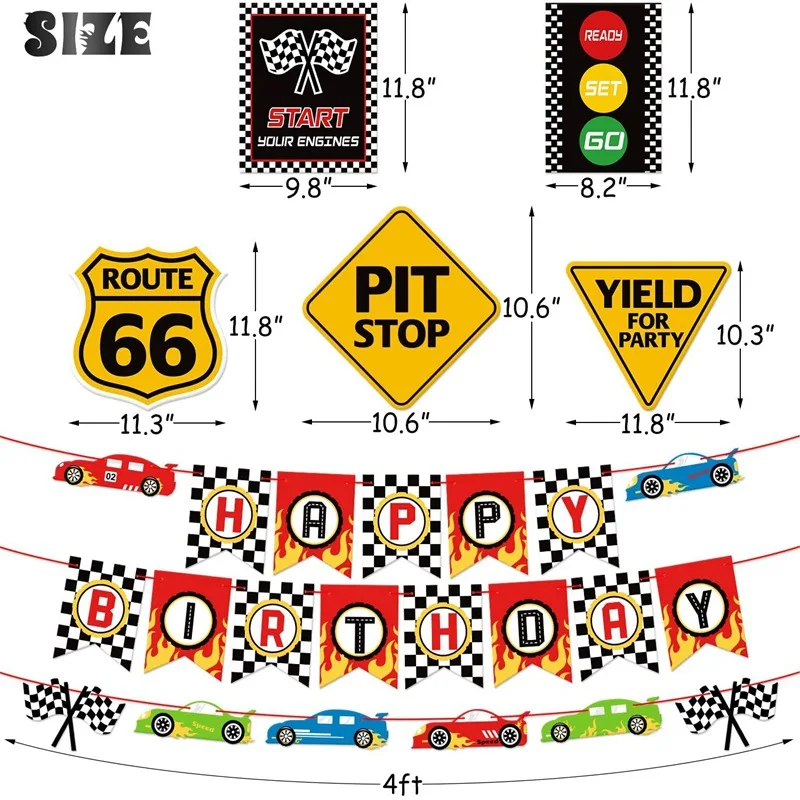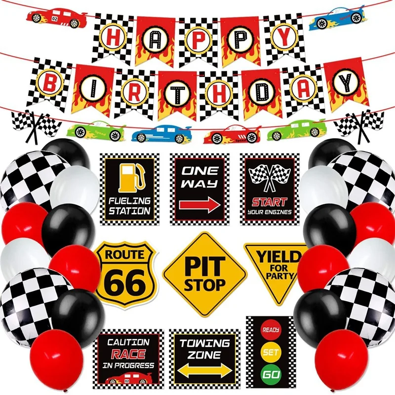 One Set Including | 31 pcs: 1* HAPPY BIRTHDAY banner 1* racing pulled 9* car logo cards 16* 12 Inch latex balloons(6*Red, 6*Black, 4*White) 4*18 Inch balloons |
