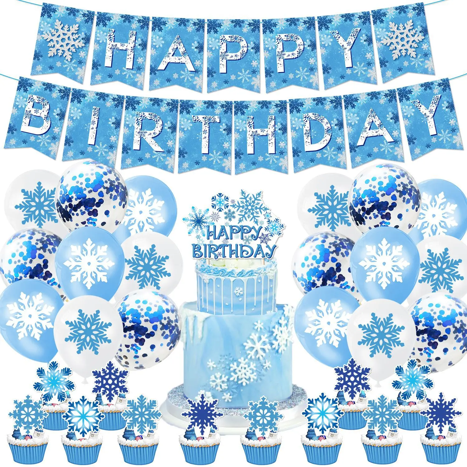 Snow Theme Blue Happy Birthday Party Decoration Set