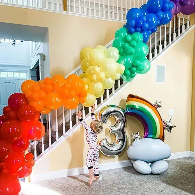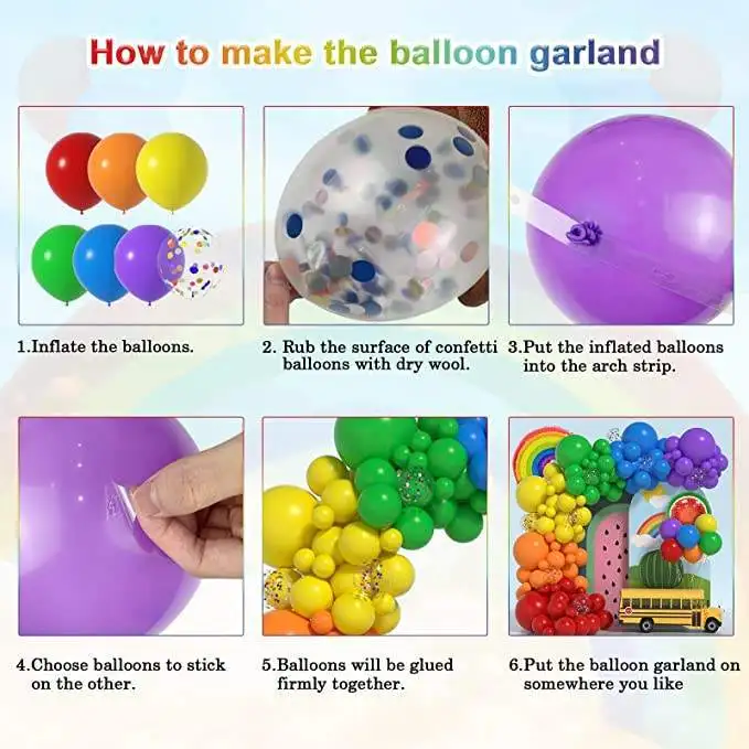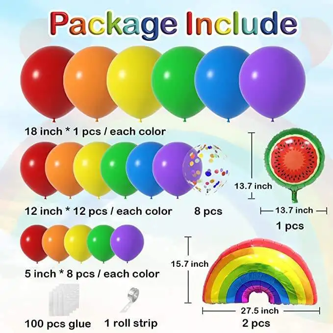 Each set includes | 131pcs: 6* 18inch latex balloon (red×1, orange×1, yellow×1, green×1, blue×1, purple×1) 40* 5inch latex balloon (red×8, orange×8, yellow×8, green×8, blue×8, purple×8) 72* 12inch latex balloon (red×12, orange×12, yellow×12, green×12, blue×12, purple×12) 8* 12inch colorful confetti balloon 2* 27.5*15.7inch rainbow foil balloon 1* 13.7inch watermelon foil balloon 1* dot glue 1* balloon chain |