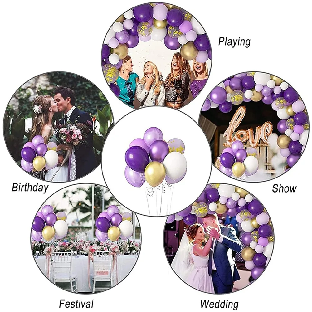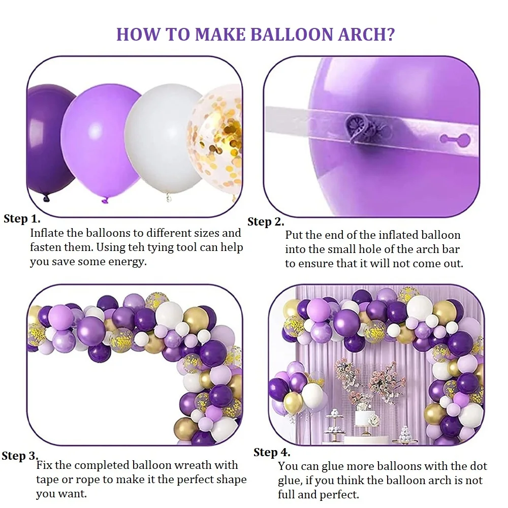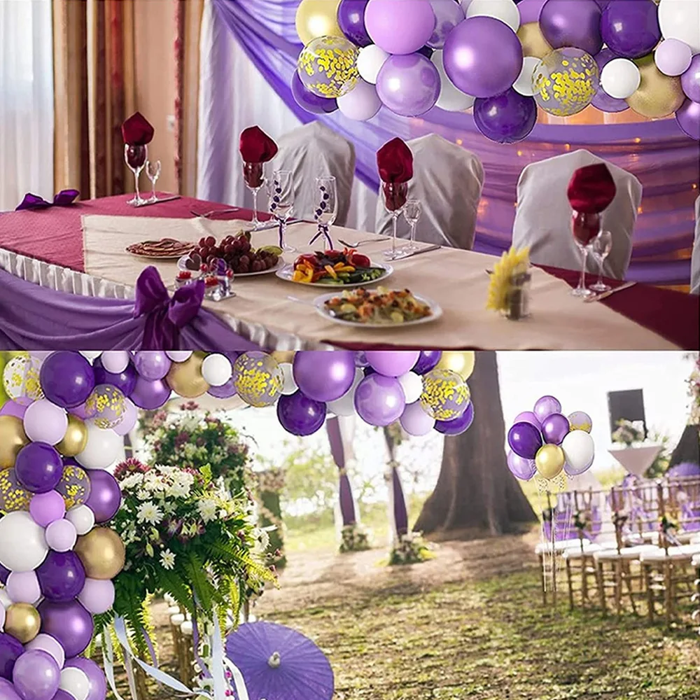 Each set includes | 128Pcs: 5* 18inch latex balloon (deep purple×3, maca pruple×2) 15* 12inch metallic gold latex balloon 10* 12inch gold confetti balloon 55* 10inch latex balloon (deep purple×20, maca pruple×20, white×15) 40* 5inch latex balloon (deep purple×20, white×20) 1* 5m balloon chain 1* ribbon 1*dot glue |
