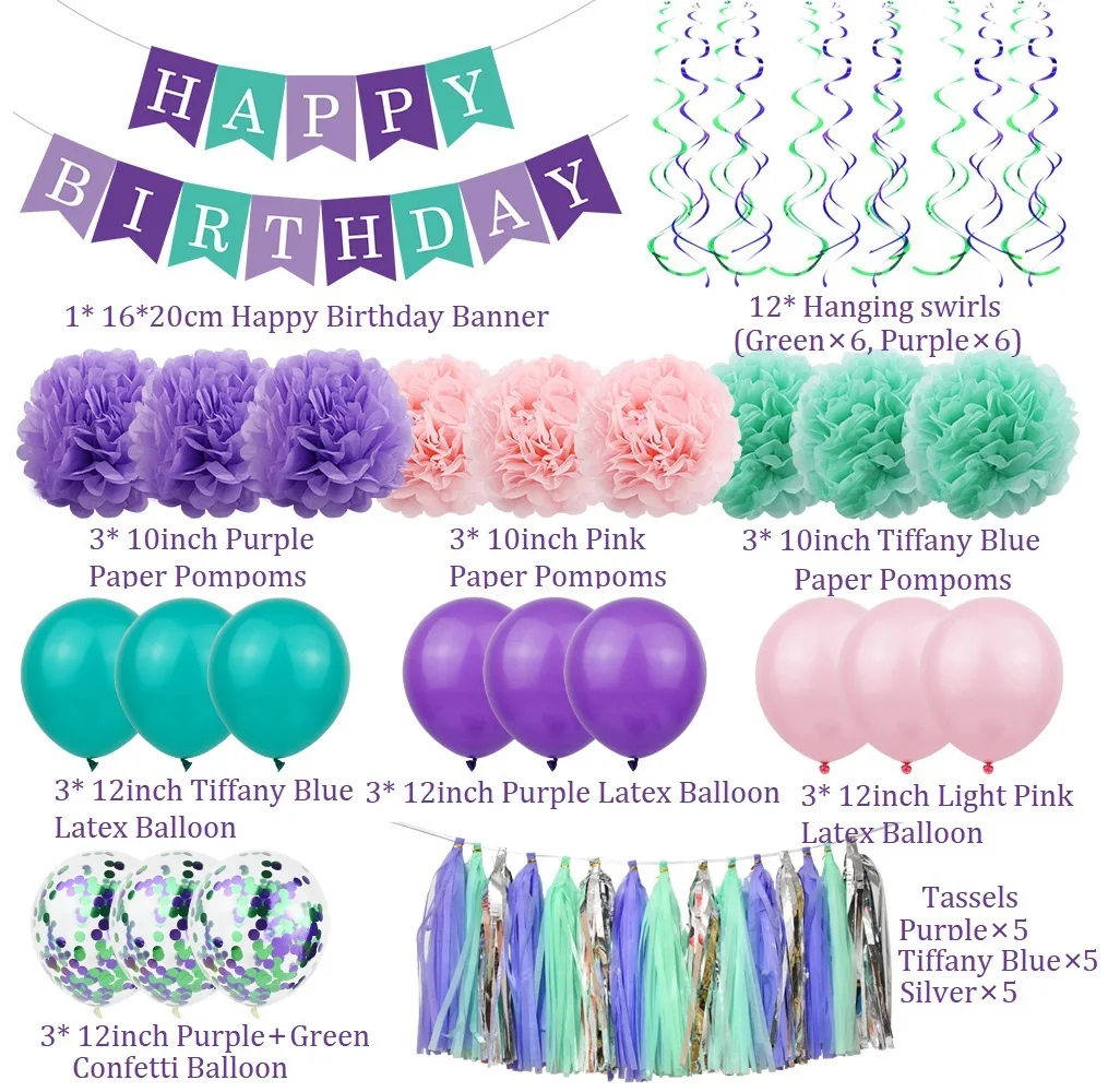 Each set includes | 49pcs: 1* 16*20cm Happy Birthday banner 12* Hanging swirls (Green×6, Purple×6) 9* 10inch paper pompoms (purple×3, pink×3, tiffany blue×3) 9* 12inch latex balloon (purple×3, pink×3, tiffany blue×3) 3* 12inch purple+green confetti balloon 15* hanging tassels (purple×5, tiffany blue×5, silver×5) |