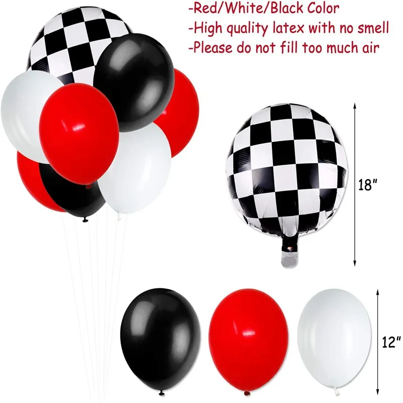 Each set includes | 31pcs: 1* HAPPY BIRTHDAY banner 1* racecar banner 9* Racing sign card 4* 18inch square grid foil balloon 16* 12inch latex balloon (black×6, red×6, white×4) |