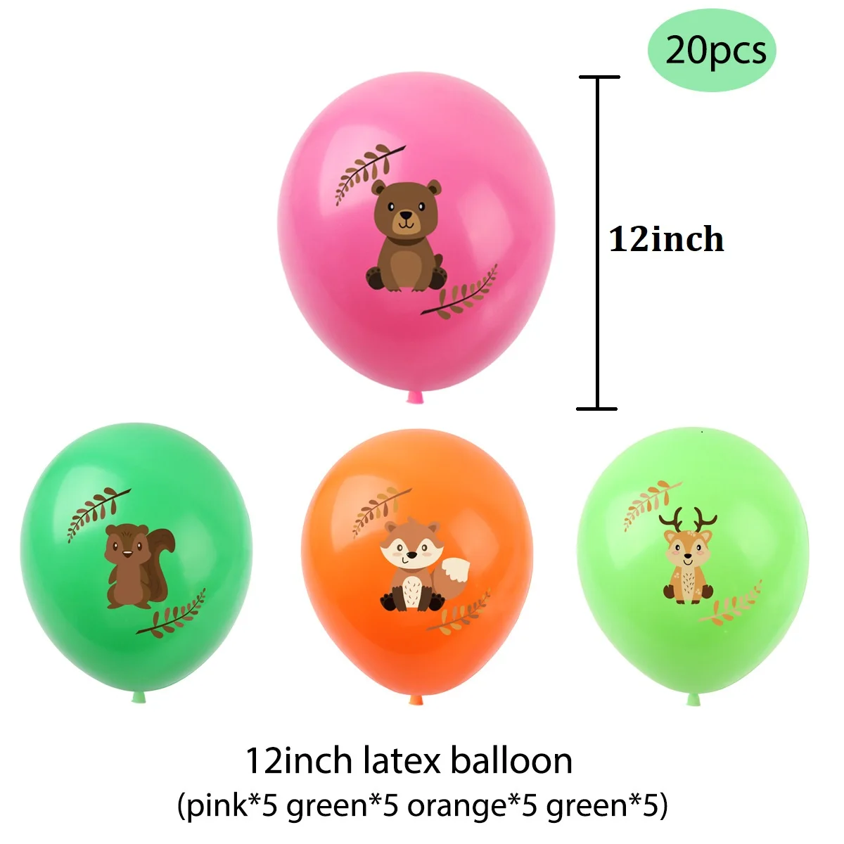 Each set includes | 35pcs: 1* forest animals HAPPY BIRTHDAY banner 1* cake topper 13* cupcake topper 20* 12inch latex balloon (orange×5, deep green×5, green×5, pink×5) 2* coil 1* dot glue |
