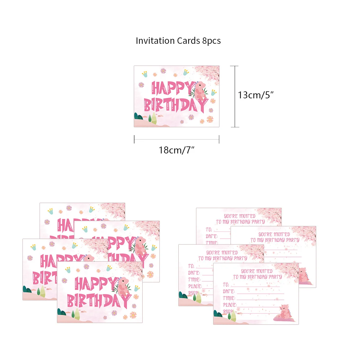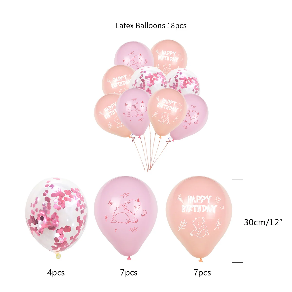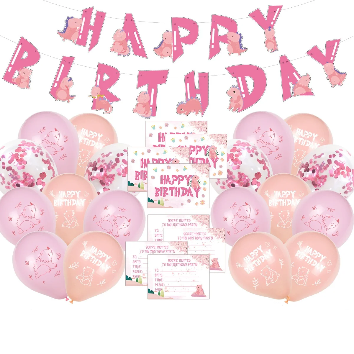 Each Set Including | 39pcs: 1* HAPPY BIRTHDAY banner 8* invitation card 12* cake rim 18* 12inch latex balloon (confetti balloon×4, pink latex balloon×7, skin color latex balloon×7) |