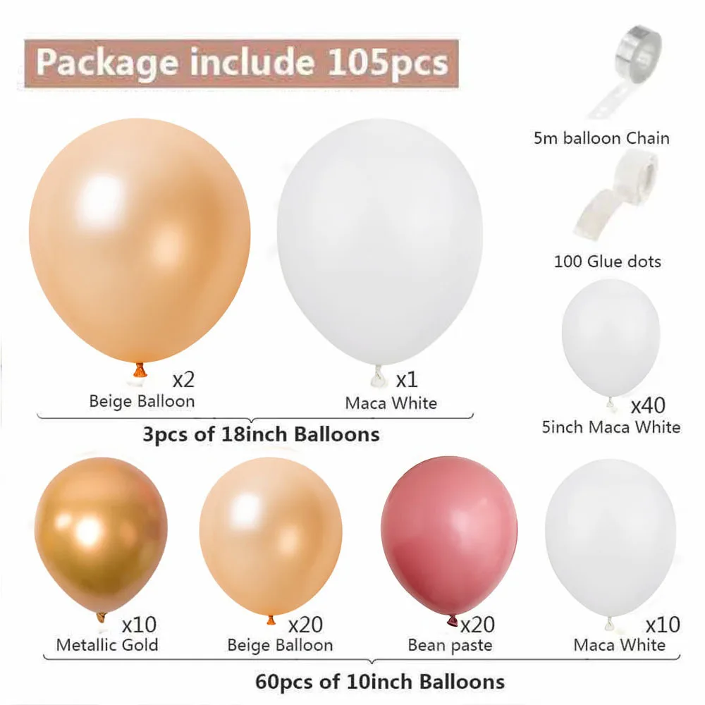 Each set includes | 105pcs: 3* 18inch Latex Balloon (Beige×2, Maca White×1) 60* 18inch Latex Balloon (Metallic Gold×10, Beige×20, Bean Paste×20, Maca White×10) 40* 5inch Maca White Latex Balloon 1* Glue Dot Roll 1* 5m Balloon Chain |