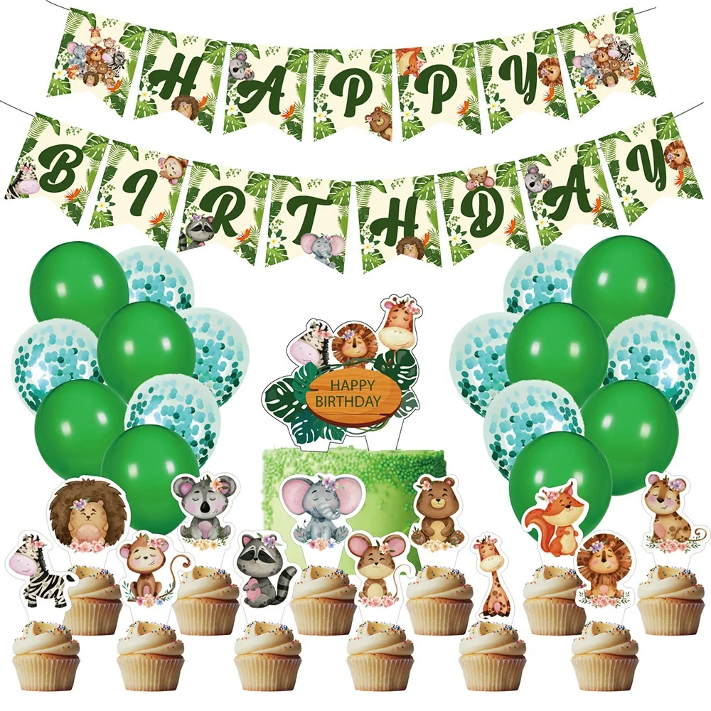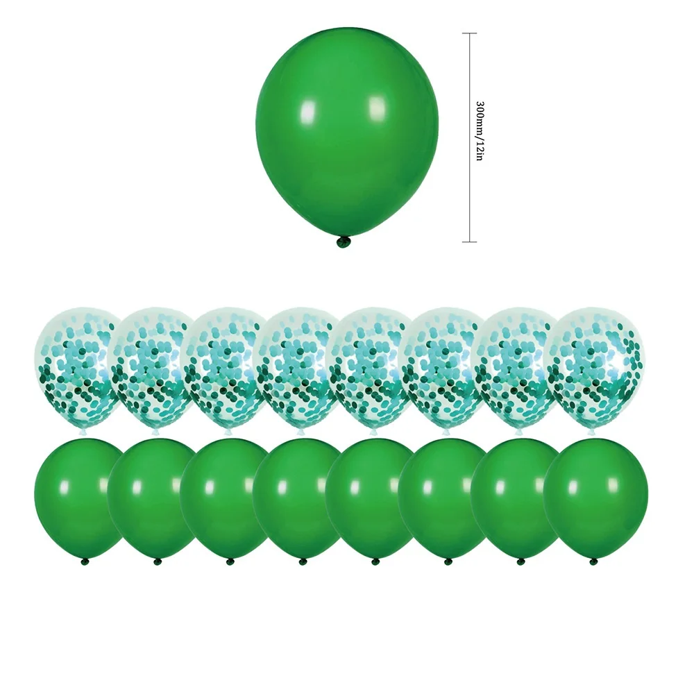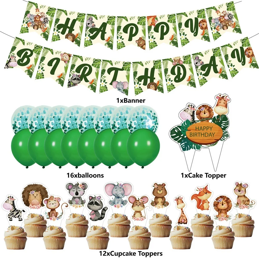 Each set includes | 30pcs: 1* HAPPY BIRTHDAY banner 1* cake topper 12* cupcake topper 8* 12inch green latex balloon 8* 12inch green confett balloon |