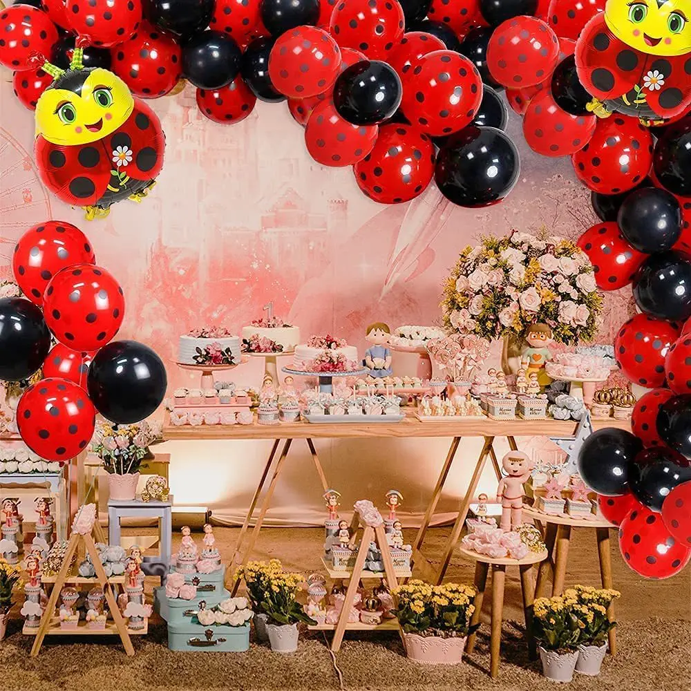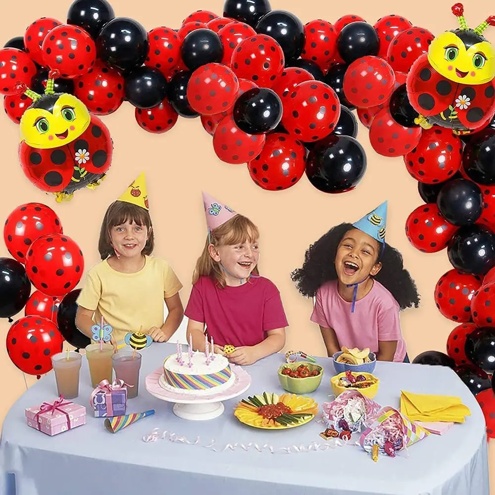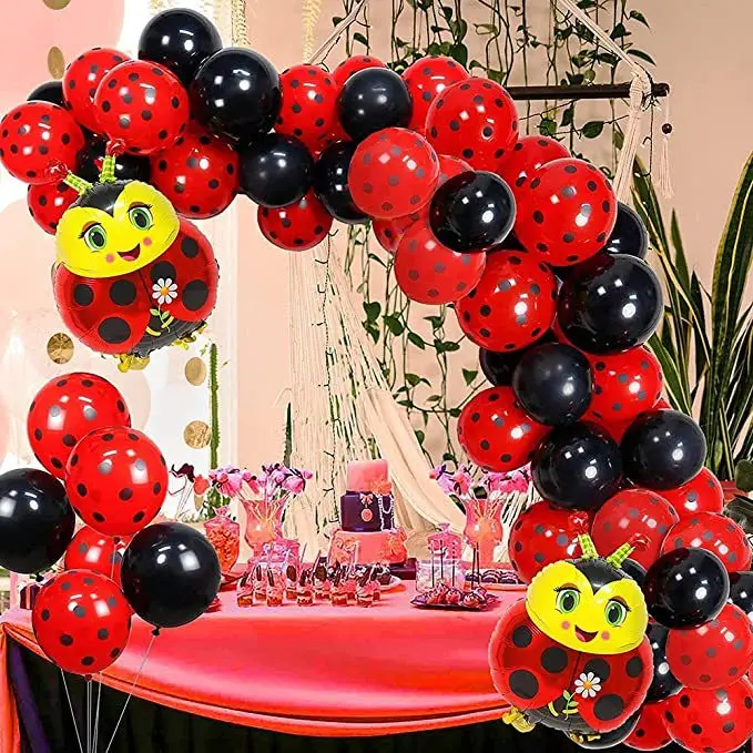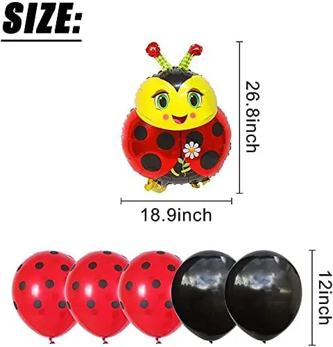 Each set includes | 106pcs: 100* 12inch latex balloon (red black dots×60, black×40) 2* ladybug foil balloon 1* dot glue 1* ribbon 1* balloon chain 1* balloon knotter |