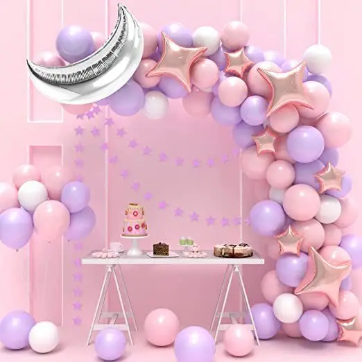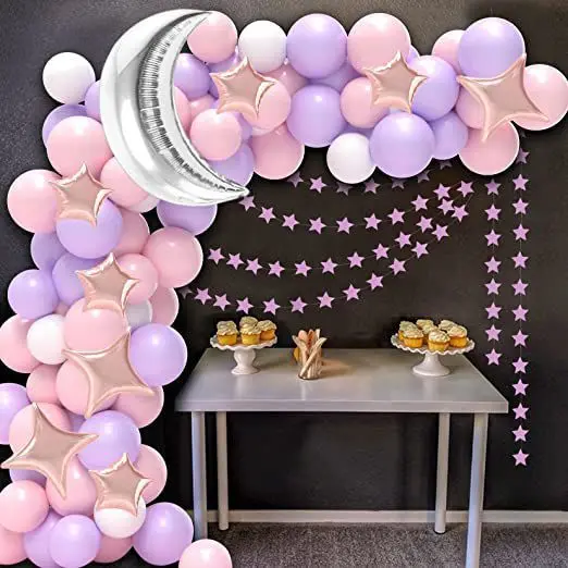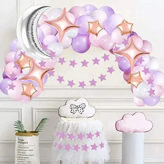 Each set includes | 84pcs: 1* 6.56ft stars banner 1* 32inch moon foil balloon 5* 10inch pink star foil balloon 3* 24inch four point star foil balloon 30* 10inch latex balloon (purple×10, pink×10, white×10) 40* 12inch latex balloon (purple×10, pink×10) 1* ribbon 1* dot glue 1* balloon chain 1* balloon knotter |