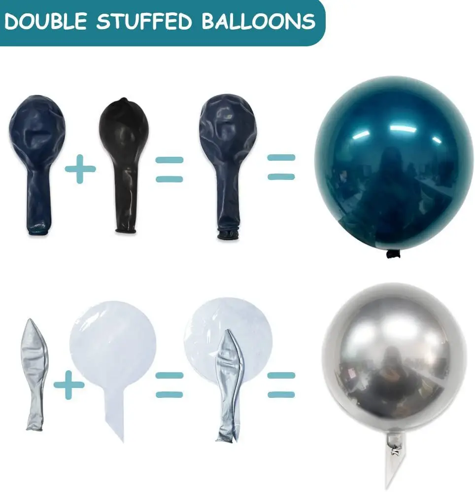Each set includes | 112pcs: 6* 18inch latex balloon (dark green double stuffed×3, white×3) 2* 18inch silver double stuffed bobo balloon 65* 5inch latex balloon (dark green double stuffed×20, metallic silver×20, white×25) 36* 12inch latex balloon (dark green double stuffed×6, metallic silver×10, white×20) 1* balloon chain 1* dot glue 1* ribbon |